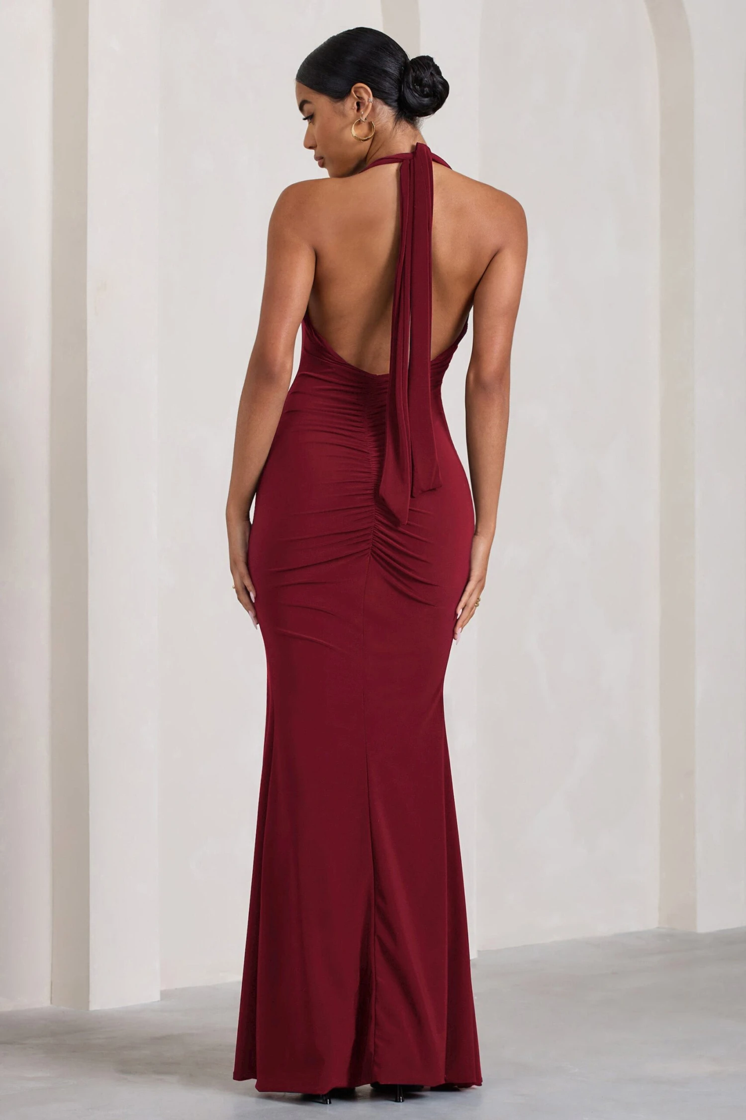 Give wow factor in our aptly named maxi dress Glamour. This berry maxi dress delivers effortless luxury, cut in a premium stretch jersey that sculpts your curves to perfection. This style showcases a feminine plunge neckline with a self-tie halter and elegant open back. Add Glamour to your evening repertoire and style this dress with a sleek bun and some strappy stilettos.Â