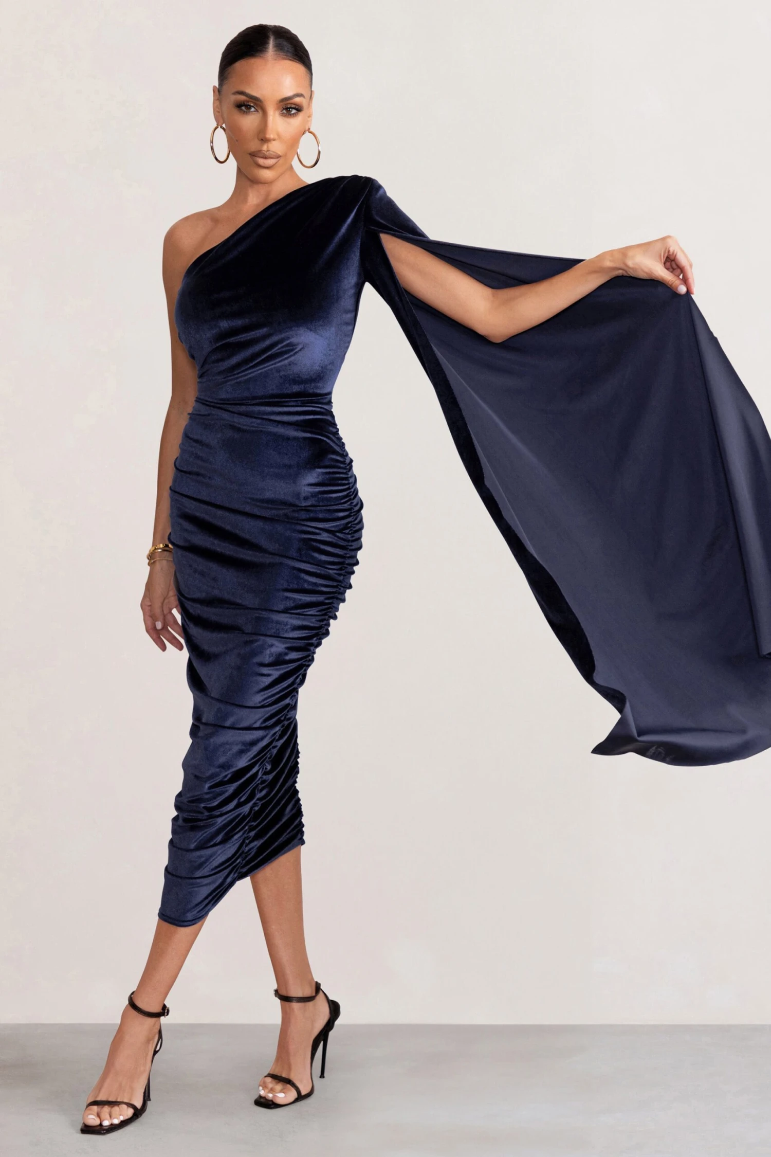 Our stunning Gloria midi dress is a must for special occasions. Featuring one shoulder detail that elegantly falls in a sophisticated cape sleeve, this midi dress is super flattering with its curve-contouring ruching creating that desired hourglass silhouette. Designed with our luxe velvet fabric in a gorgeous navy shade, this look will turn heads at your next black-tie event or glam party coming up. Shift your statement wardrobe with this gorgeous style!