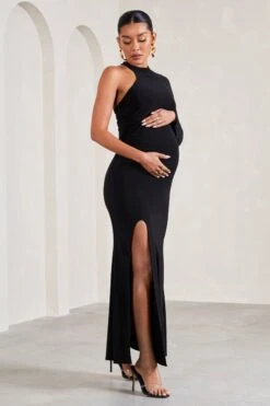Both captivating and contemporary, Heidi is sure to make heads turn at your next event. Arriving in a classic black shade of our signature stretch jersey, this one-sleeved maternity maxi dress is detailed by a high neckline, bump ruching and leg split. Elevate this formal look by pairing Heidi with a sleek bun and statement earrings.Â