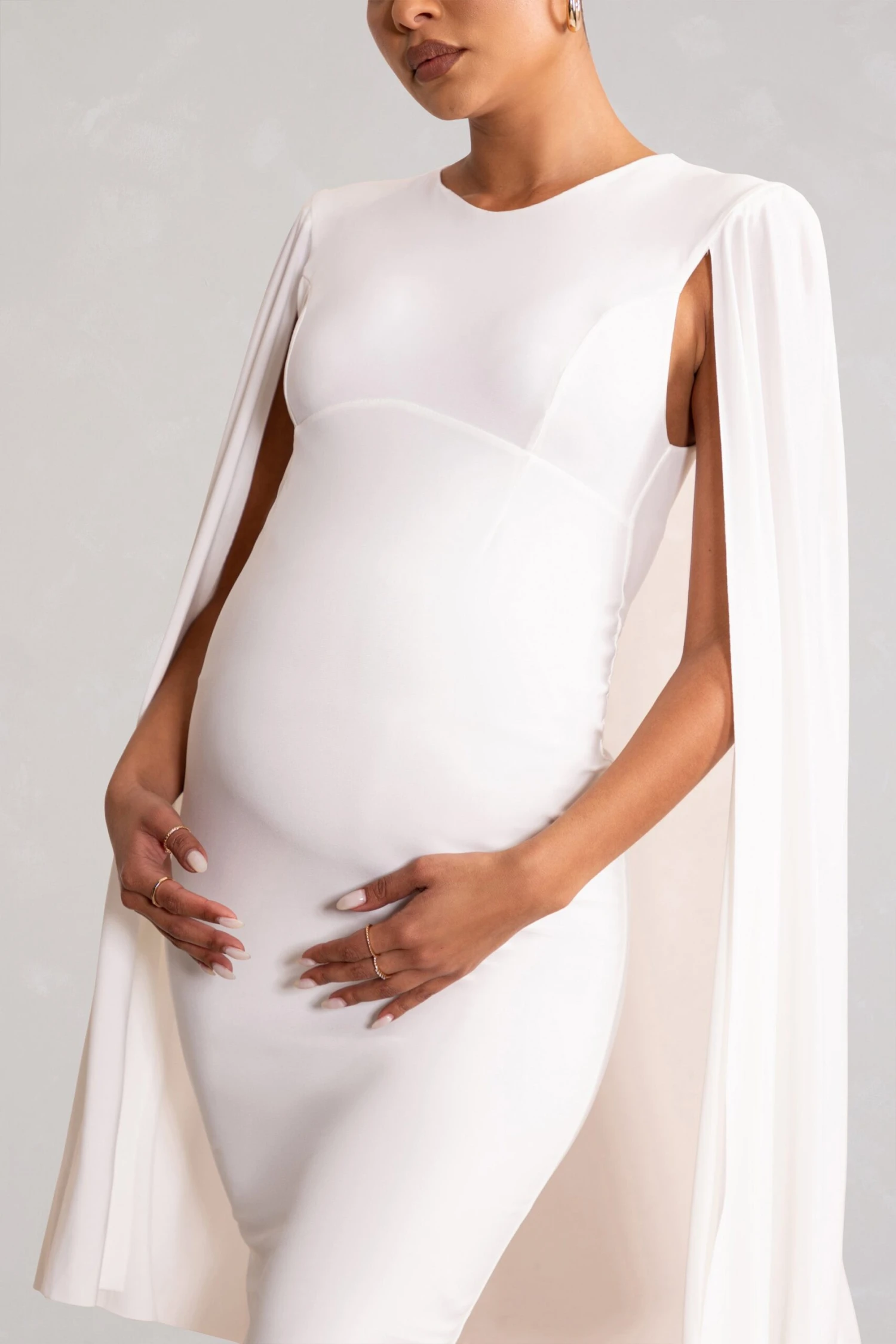 Get set to wow ’em all with our stunning “Hey Mama” maternity cape midi dress! Designed to flatter and sculpt your bump, this gorgeous dress certainly serves up the high-impact glamour. It features dramatic statement cape sleeves that are balanced out by the demure high neckline and mid-length hem.