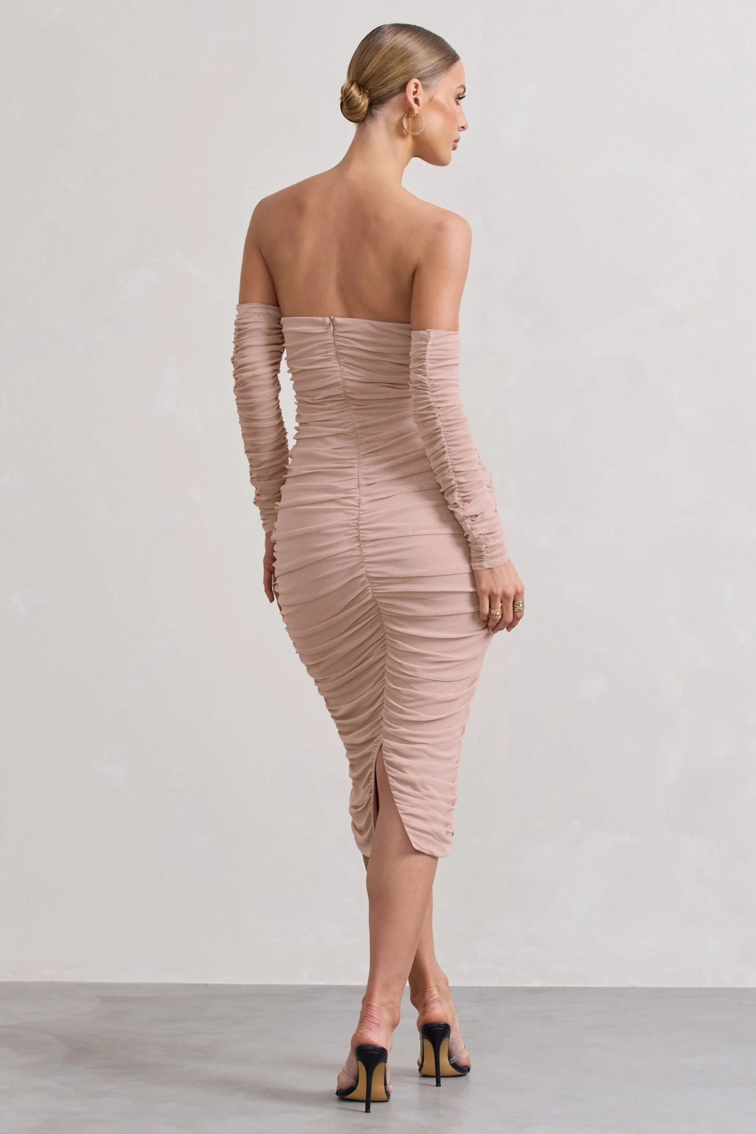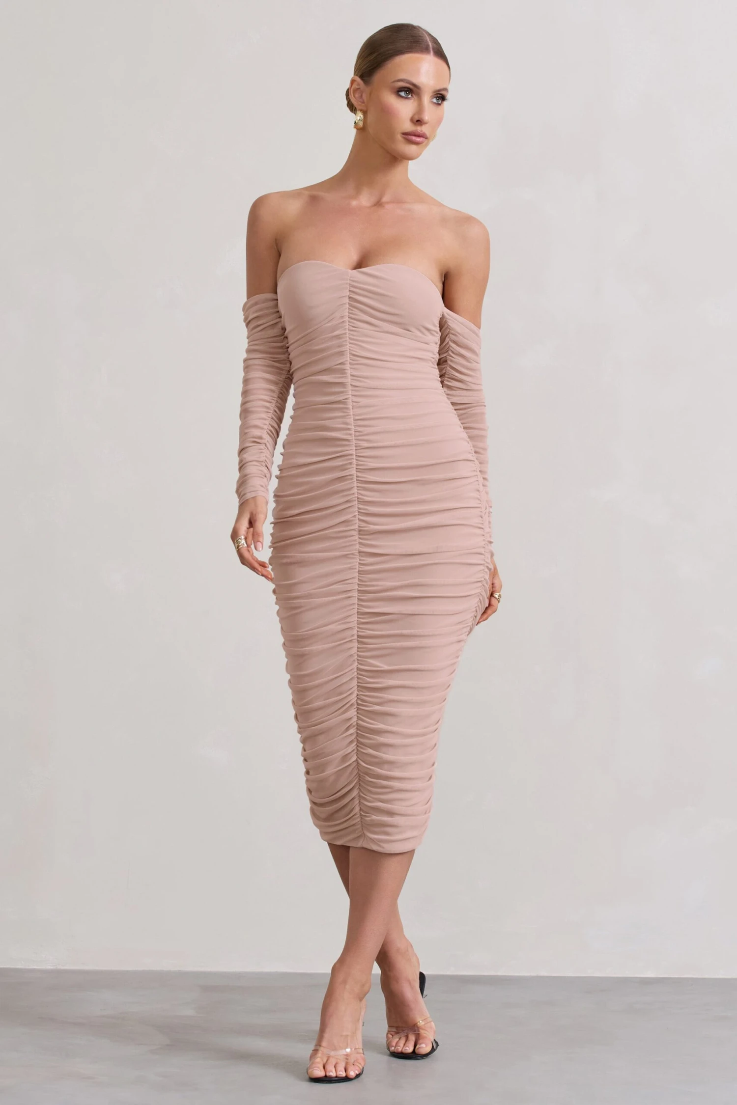 Arriving in a curve-enhancing silhouette, captivate from all angles in Indy. This champagne midi dress is ruched to perfection with a subtle sweetheart neckline and long mesh sleeves. Complement this style with a sleek bun and statement earrings for your next event.