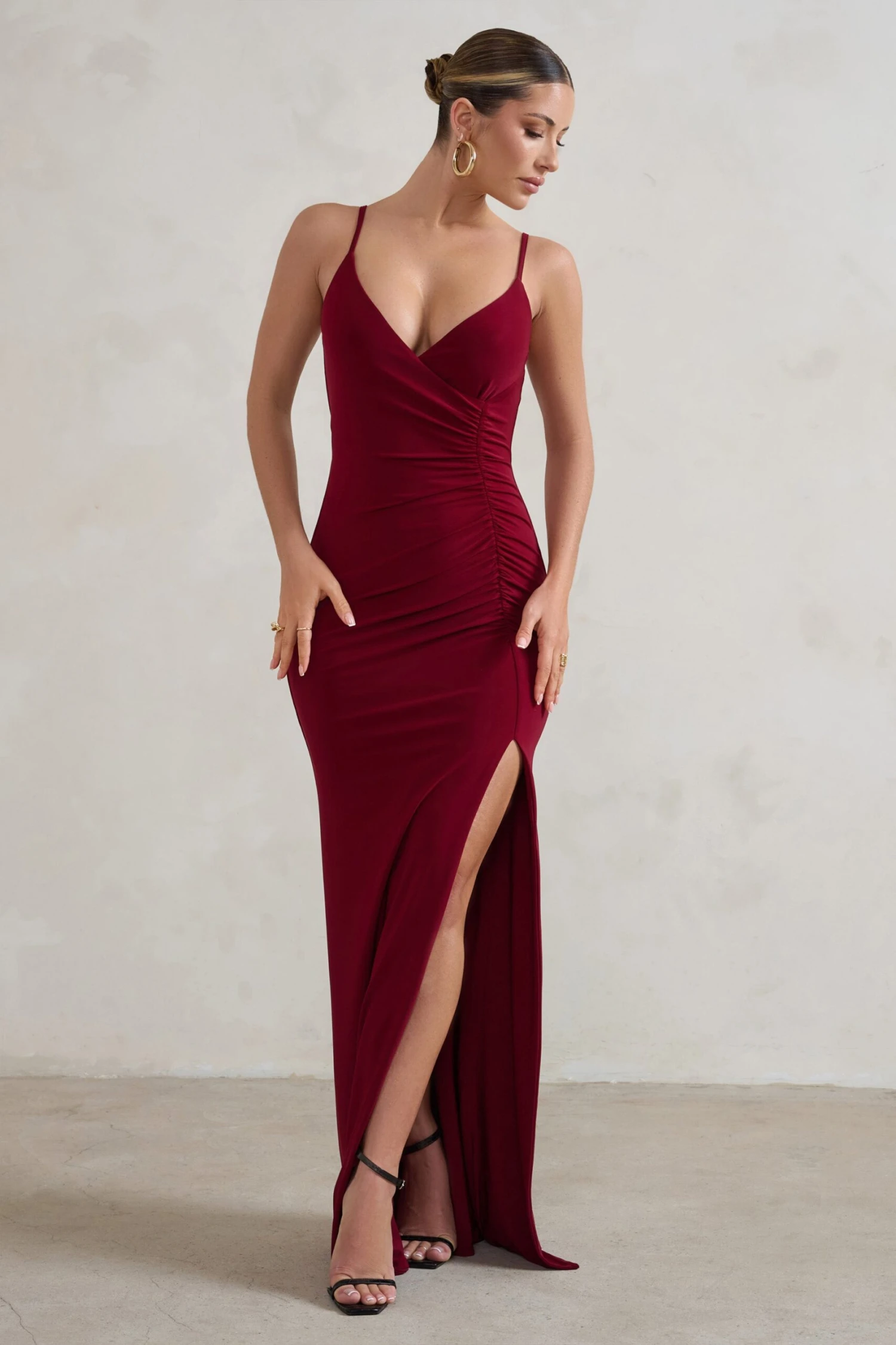Wrap silhouettes truly never no out of style and our latest design, Jeanne, is the perfect option to please every bridesmaid. The ruched maxi dress arrives in our premium berry red jersey with a plunging v neckline, slim straps and a daring split to showcase the leg. Pair Jeanne with diamante hoops for a touch of sparkle to entice the eyes of every wedding guest.