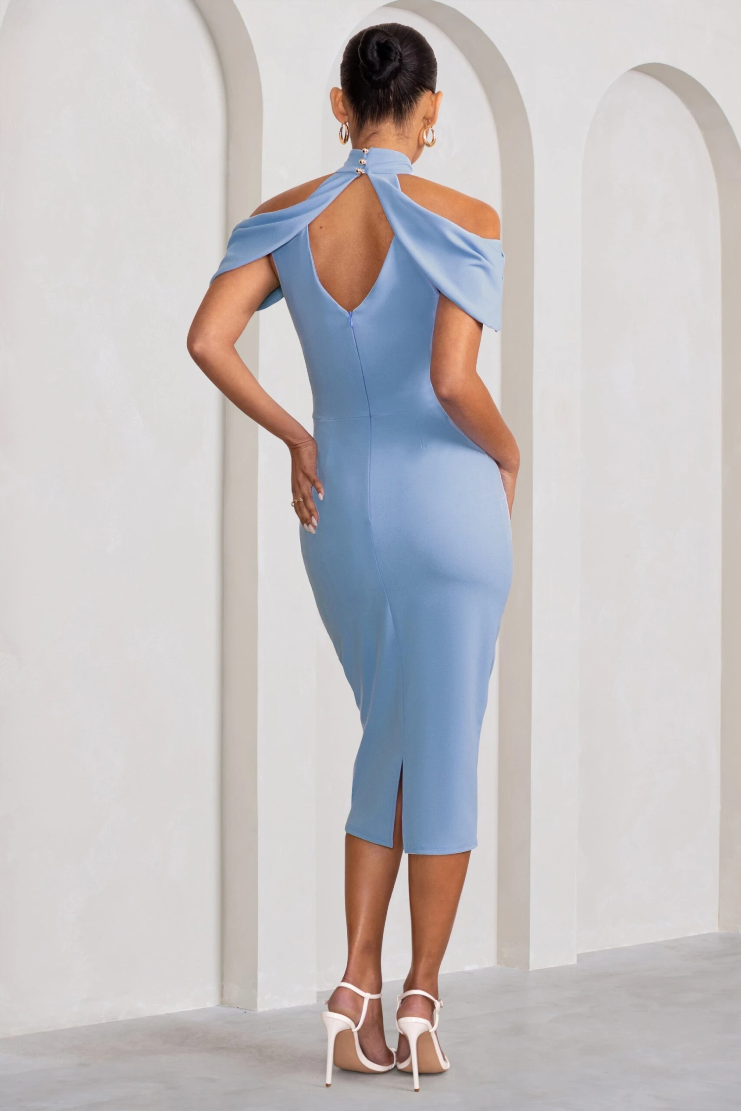 Make a glamorous statement in Jemima, our midi dress in a beautiful powder blue. Crafted in our premium stretch crepe fabric, this dress will seamlessly skim your silhouette for a truly gorgeous finish. Featuring a high neckline juxtaposed with draped Bardot detailing and a midi cut, Jemima is the perfect dress for an event. Steal the show in Club L.