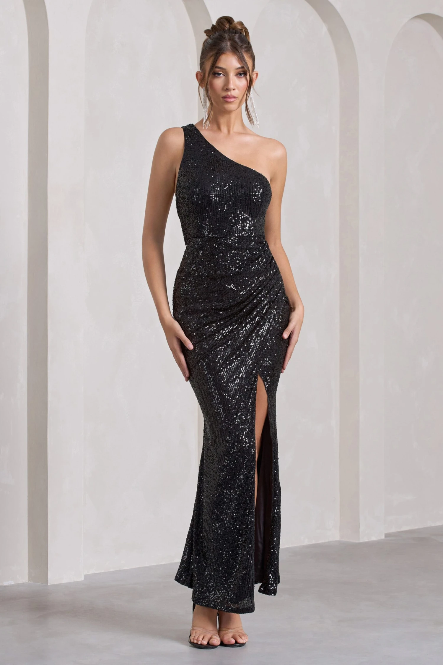 Juliet | Black Sequin One Shoulder Open Back Wrap Skirt Maxi Dress