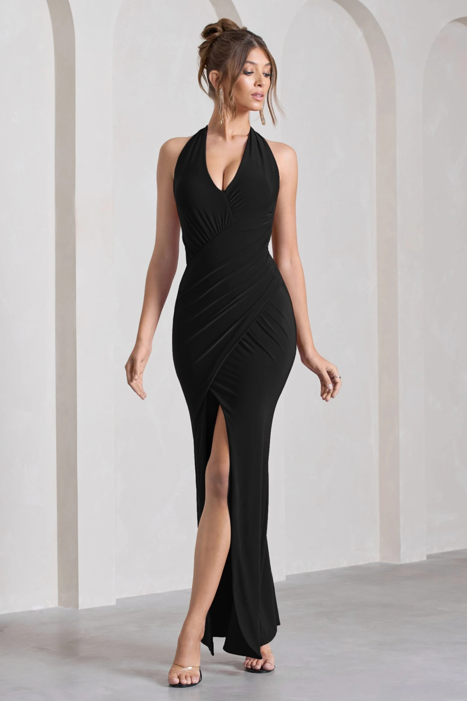 Captivate from all angles in Leonie, our floor-length black maxi dress. Cut from our body-sculpting jersey, what makes this style stand out is its carefully placed asymmetric wrap panels that cinch your waistline. For a timeless black tie ensemble, try styling Leonie with a sleek bun to give its open-back the attention it deserves.Â