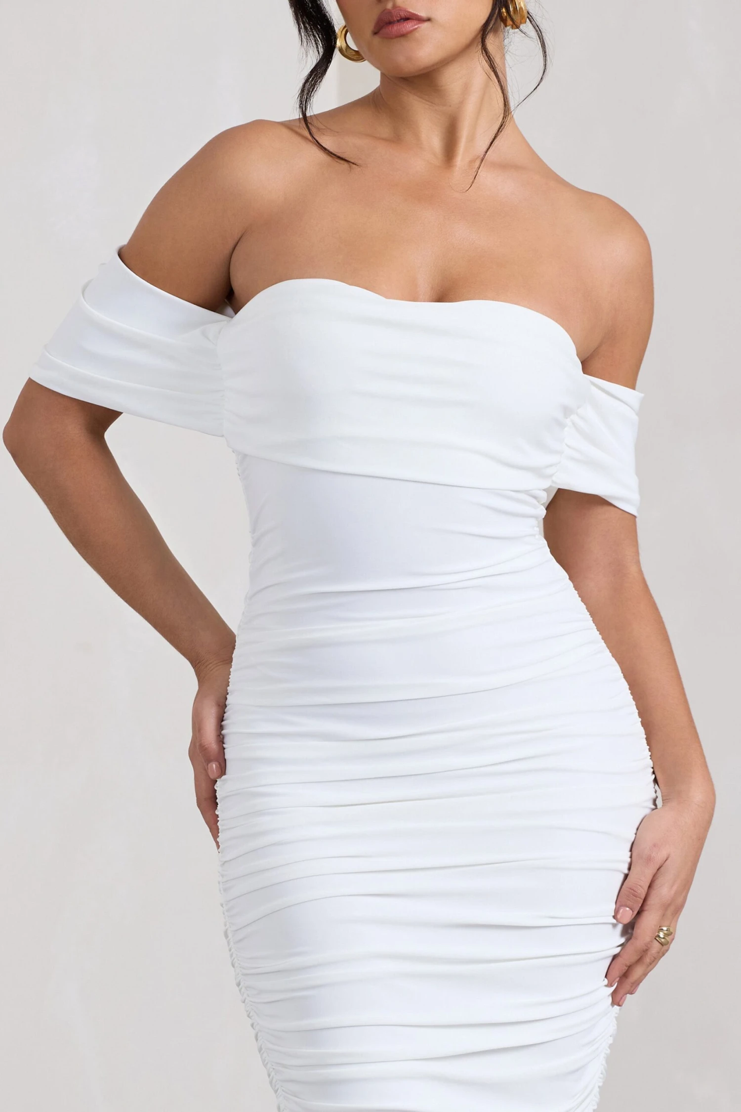Leave wedding guests lost for words in this aptly-named midaxi dress. Designed in a breathtaking Bardot silhouette, Lost For Words boasts a bodycon fit made from stretchy ruched jersey. Style this white off-shoulder dress with simple accessories like clear slip-on pumps and let your sculpted curves be the overall focus.