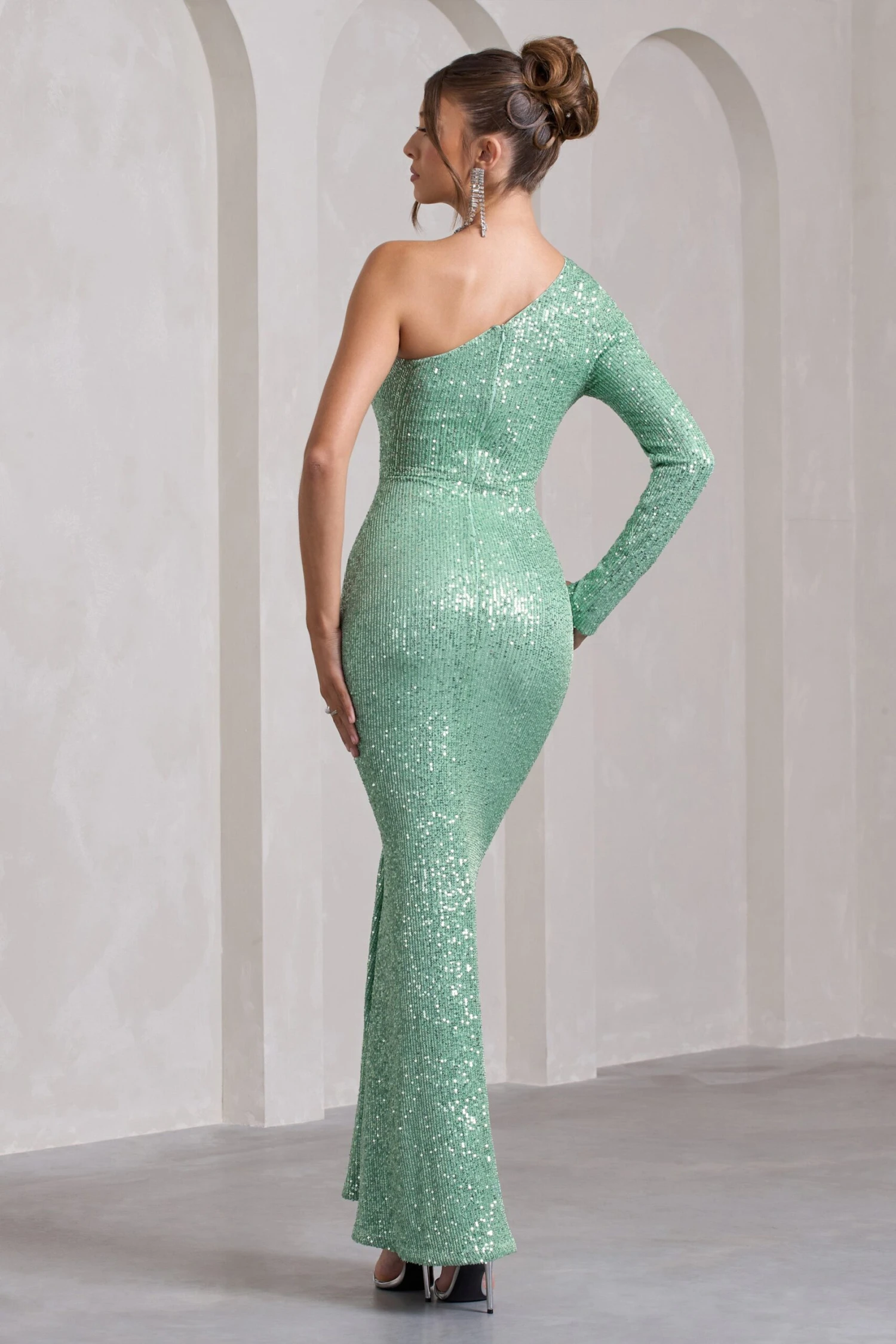 Eye-catching in both fabric and colour, our Love Language maxi dress arrives coated in glistening sequins. A statement piece for any special event, this mint green maxi features an asymmetric neckline accompanied by a ruffled floral corsage. Keep Love Language at the forefront of your next event by styling yours with some strappy stilettos and a sleek bun.Â
