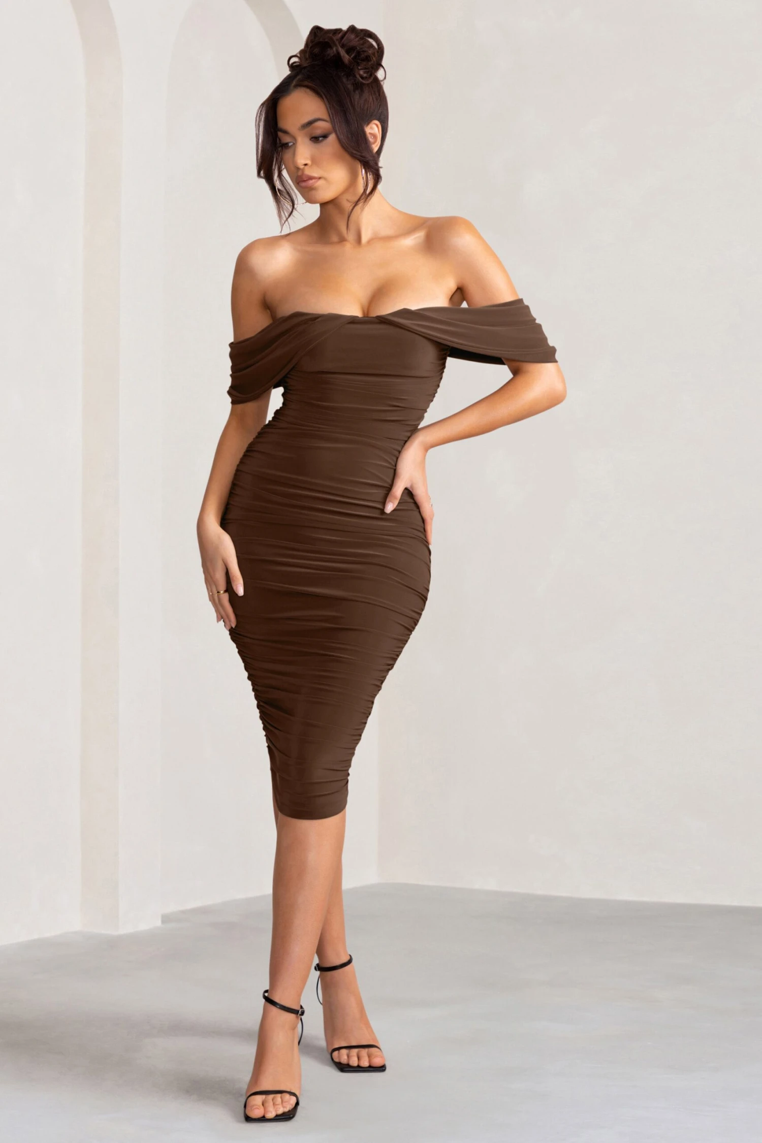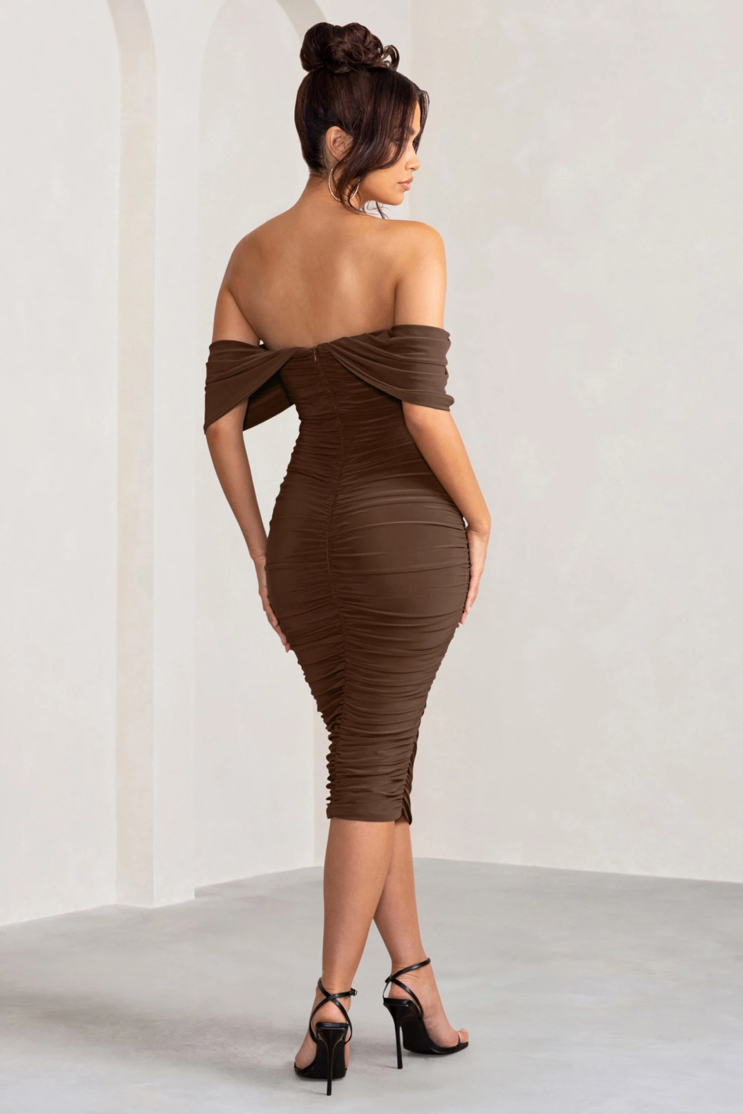 A classic fit with a touch of glamour, Love Me in a rich chocolate hue is the perfect dress for your next event. Featuring an elegant Bardot neckline that reveals your decolletage, this midi will contour your beautiful figure with its full-body ruching covered by our delicate mesh. Designed with our premium jersey fabric, this curve-contouring look is perfect for VIP events, weddings, or black-tie events. Steal the show in this flawless midi!