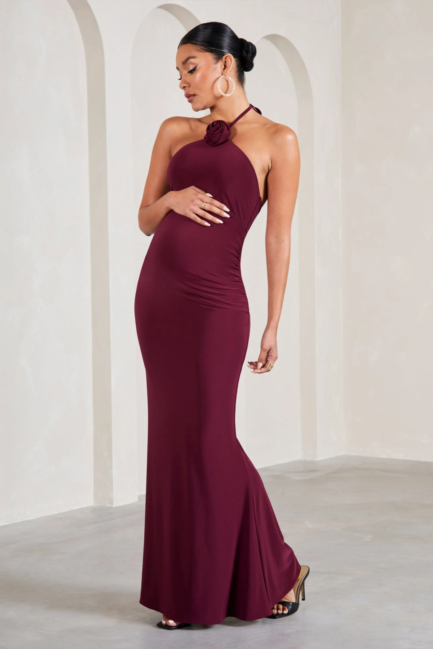 Exude a romantic state of mind in our burgundy maternity maxi Loving. Defined by a statement floral corsage, this halter-neck arrives in a smooth stretch jersey renowned for its sculpting capabilities. For the perfect baby shower ensemble, try styling Loving with a sleek bun and strappy stilettos.Â