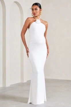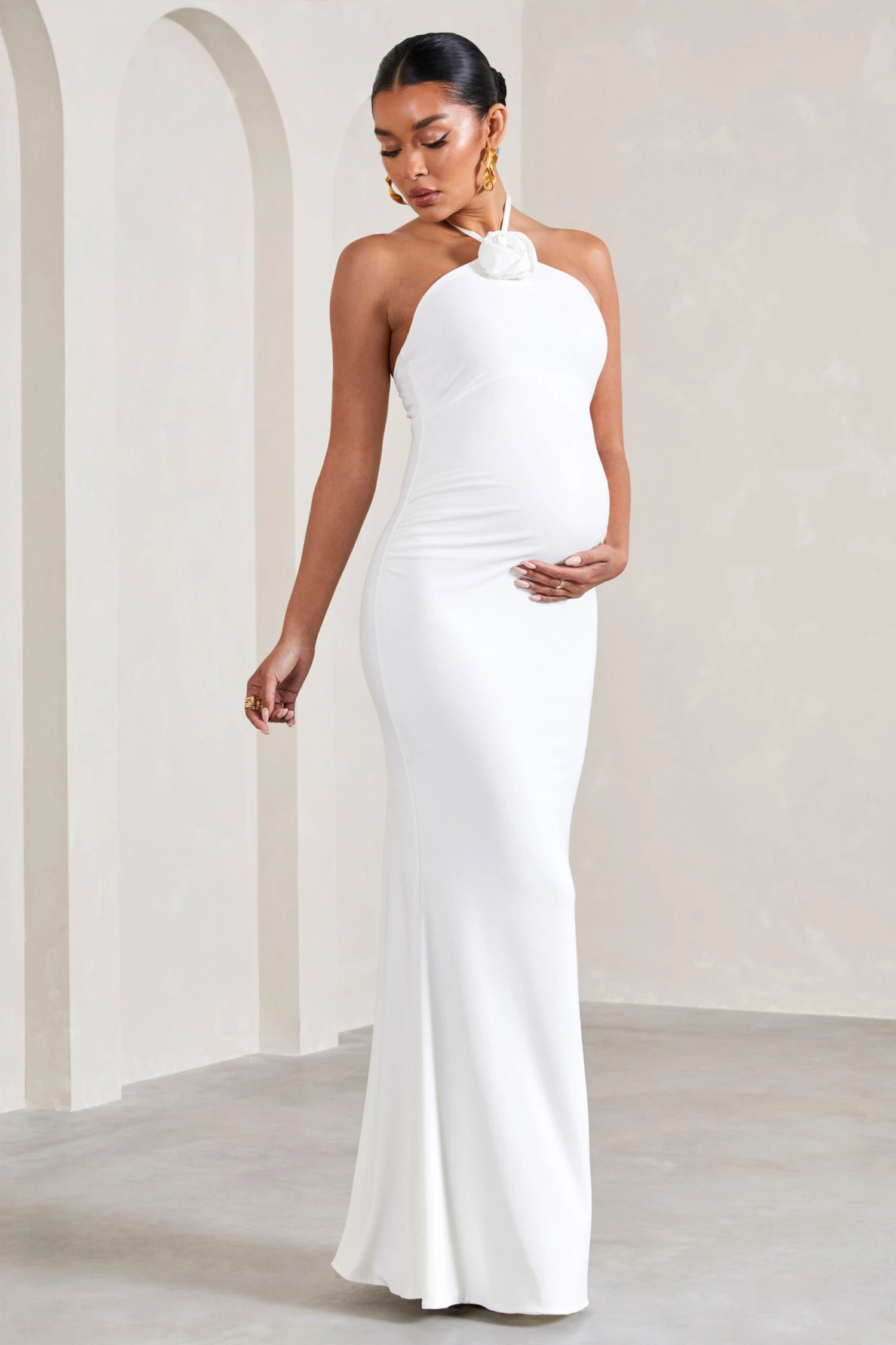 Exude a romantic state of mind in our white maternity maxi Loving. Defined by a statement floral corsage, this halter-neck arrives in a smooth stretch jersey renowned for its sculpting capabilities. For the perfect baby shower ensemble, try styling Loving with a sleek bun and strappy stilettos.Â