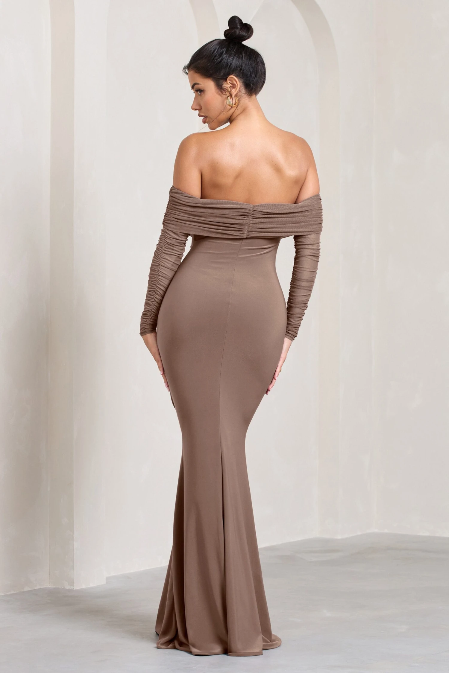 Meet Madeleine, a beloved silhouette from the Club L archives reintroduced in our premium mocha jersey with a Bardot neckline wrapped by flattering ruching. Complementing this bodice are long mesh sleeves whilst a floor-length fishtail skirt guarantees you make a memorable entrance at any formal event from weddings to grand engagements.