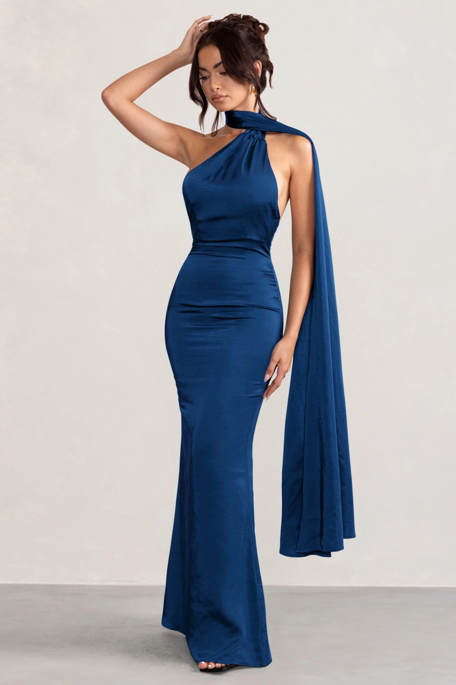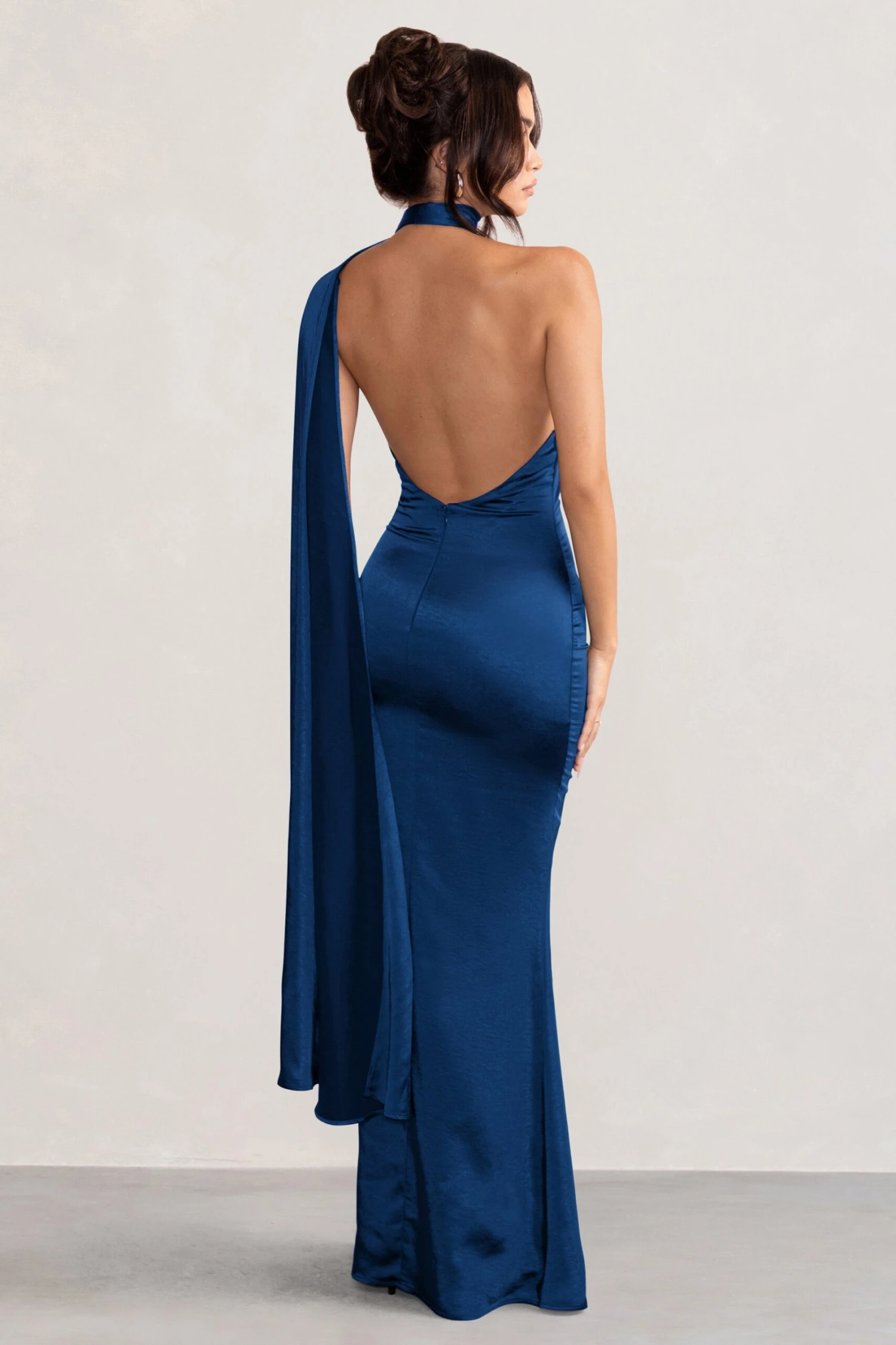 Make the most of every occasion in our beautiful Mademoiselle maxi dress. With a feminine asymmetric scarf neck that elegantly falls down the super feminine cowl back detail, this dazzling rust satin design is pure sophistication. You will look stunning in this gorgeous navy gown at your next VIP party, black-tie or gala event.