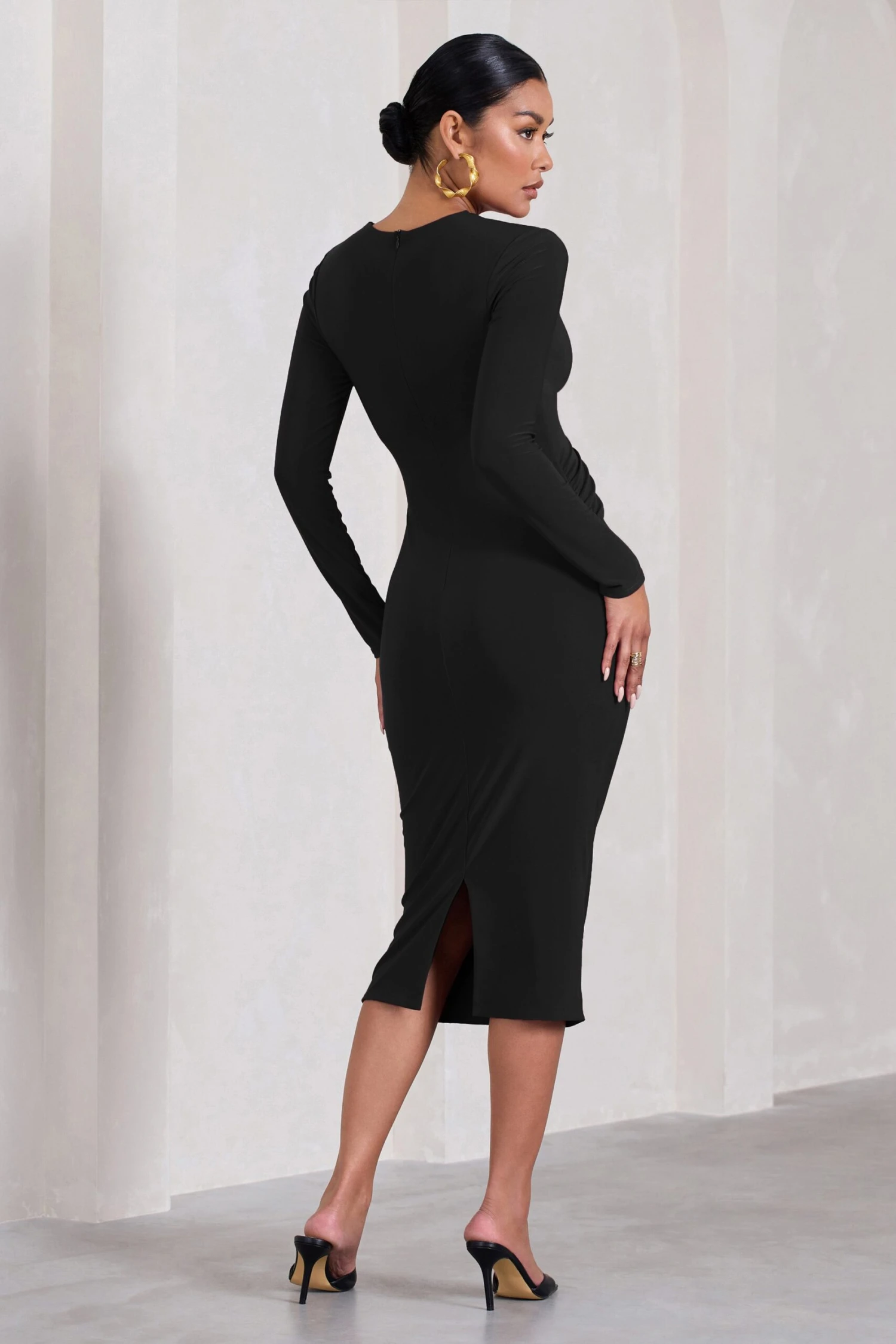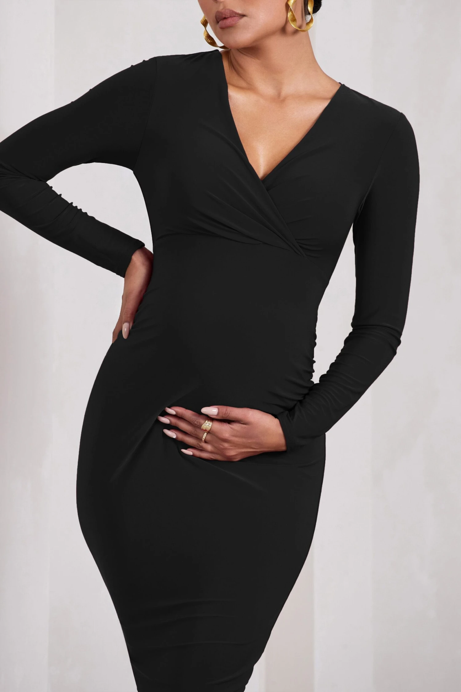 Every maternity wardrobe needs a sculpting staple like Marcia. Crafted in a classic black shade of our premium stretch jersey, this bodycon midi features a plunge neckline, subtle bump ruching and a functional split at the back for ease of movement. For a sophisticated evening look, try styling Marcia with a sleek bun and gold accents.