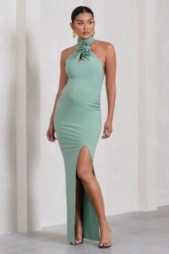 Exude a romantic state of mind in Marissa, our sage green maternity maxi. This enchanting style has been crafted in a premium stretch jersey known for its sculpting abilities and comfort levels. Characterised by a delicate floral corsage that sits on a crossed halter neckline, Marissa boasts an open-back feature and high-leg split. For the perfect baby shower look, try styling this maxi with a sleek bun and strappy stilettos.Â
