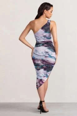 Late Night | Multi Printed Asymmetric One Shoulder Ruched Midi Dress