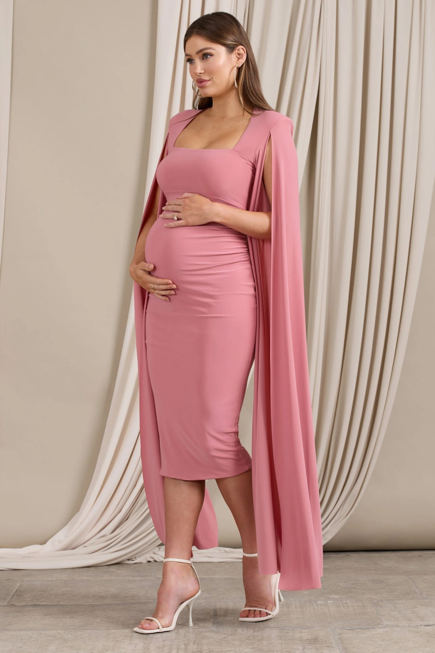 Meaningful is the perfect maternity dress to celebrate your blossoming figure in the season ahead. Designed in supportive stretch jersey in a sweet pink shade, this midi dress comes in a bodycon silhouette with sweeping cape sleeves that drape off structured shoulders. Meaningful would be especially memorable worn to a baby shower or a special dinner date.