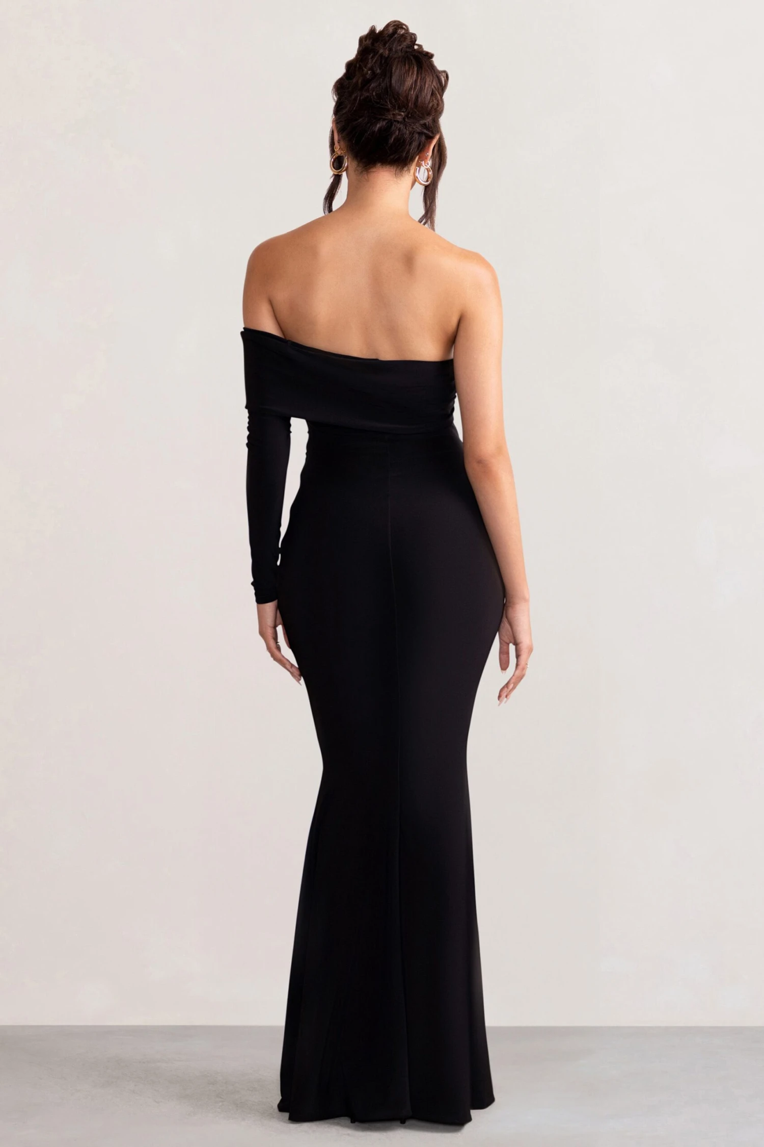 Whether you’re attending a wedding or a black tie event, you’re sure to stand out at any special occasion in our Meghan maxi dress. This curve enhancer is crafted from premium stretch jersey in an asymmetric fishtail silhouette with a delicate gathers around the waistline. Designed to showcase your decolletage, the black bodycon dress also features a Bardot neckline with one long sleeve and a striking leg split.