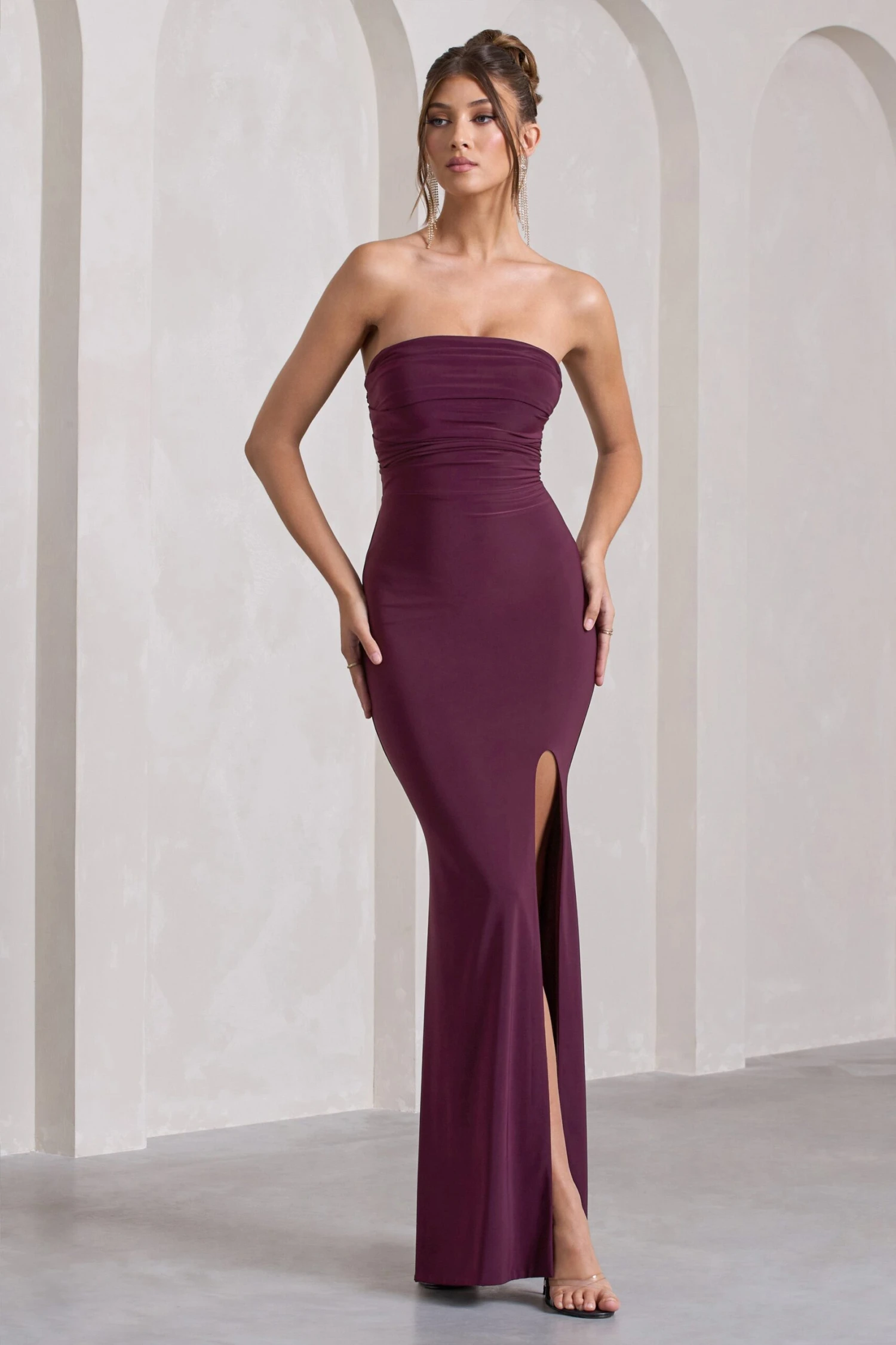 Arriving in a rich plum hue of our body-contouring jersey, Midnight Calling is a captivating choice for any event. Further elevated by a waist-cinching lace up back, this strapless maxi dress is completed with a striking high-leg split. For an enchanting black tie look, pair this plum piece with a sleek bun and some statement earrings.Â