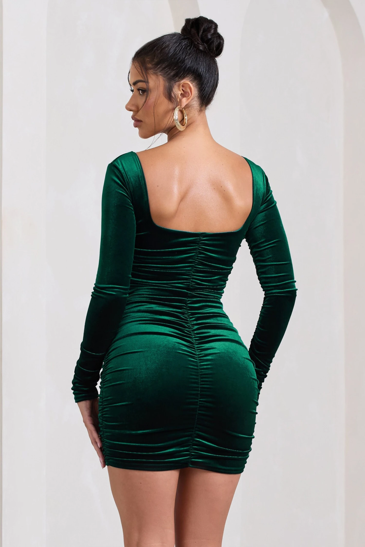 Make a sultry statement in our gorgeous Muse velvet mini dress. The bottle green hue of this showstopping dress makes it the perfect piece for the festive season. The flattering square neckline which shows off your decolletage is juxtaposed with long sleeves, creating a dress that perfectly balances fun and sophisticated style. The fitted feminine silhouette of Muse and the ruched detailing lets you show off your curves with confidence for an effortlessly sleek look that is a must-have for any celebratory occasion.