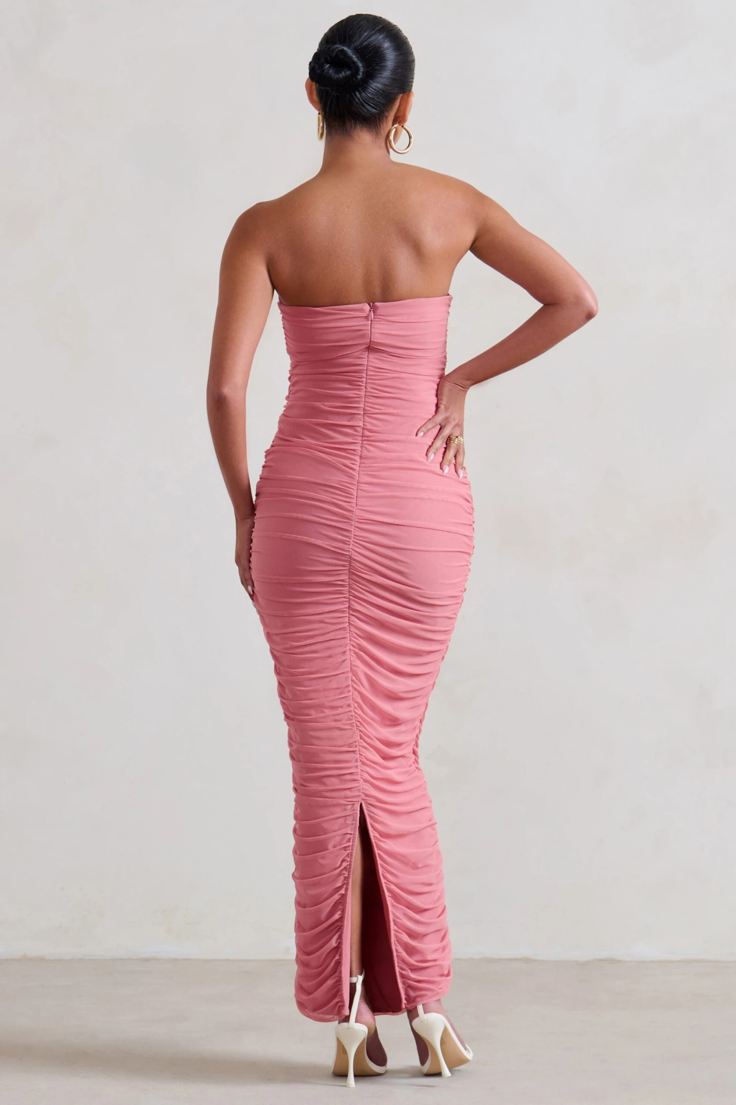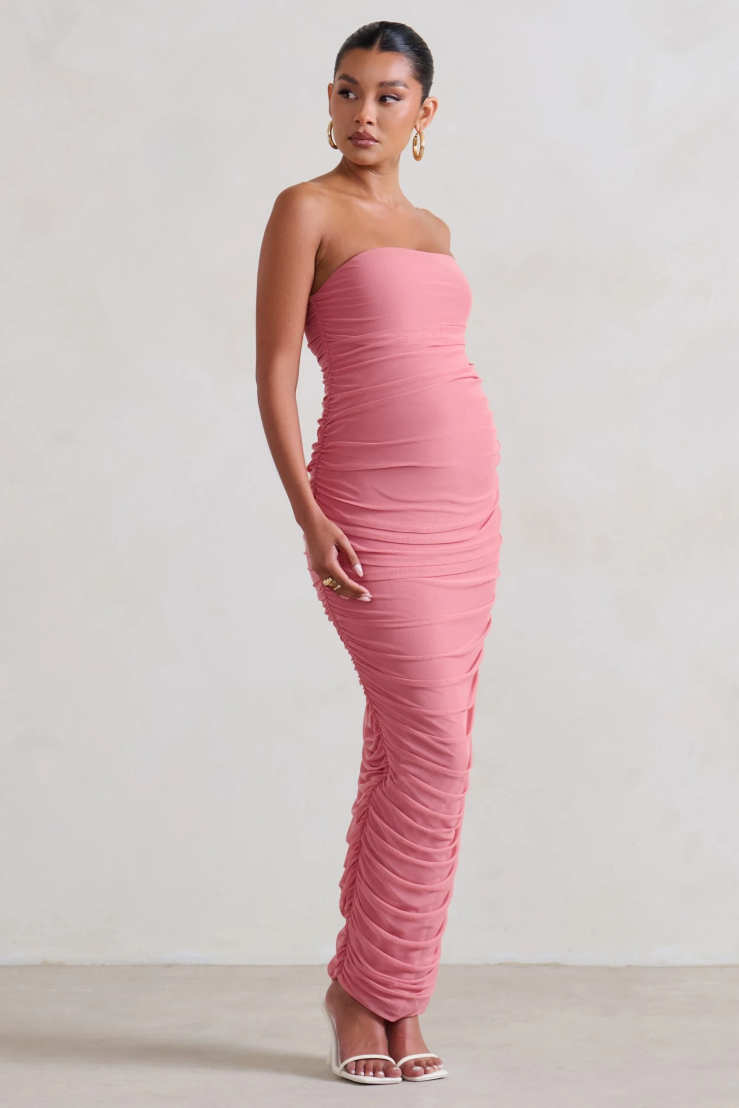 A chic strapless silhouette with a split hem defines our maternity maxi dress, My Lady. Designed in a pink mesh fabric that’s fully ruched to enhance every curve, we picture this bandeau bodycon dress at a baby shower but My Lady would turn heads at any special occasion you have upcoming.