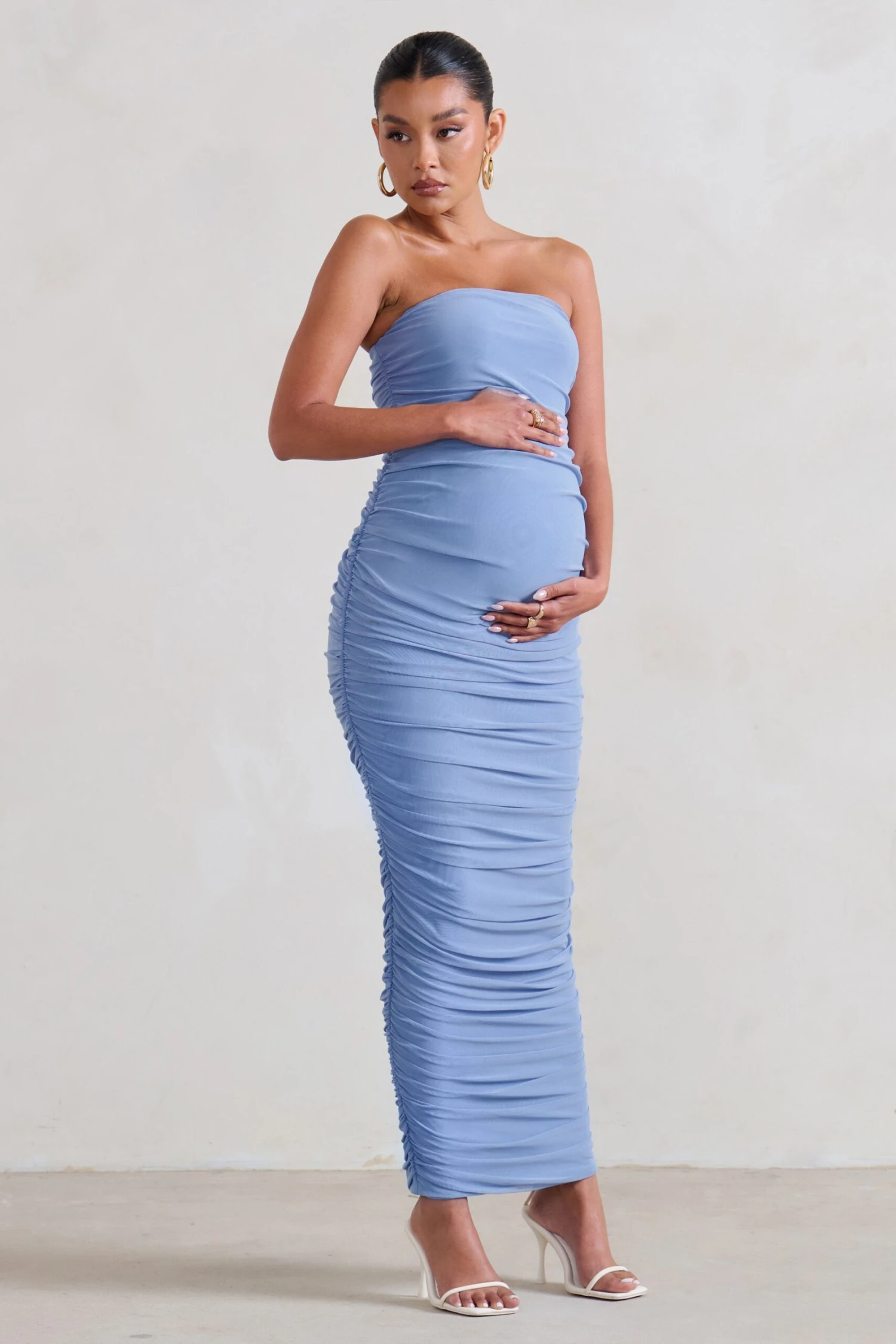 A chic strapless silhouette with a split hem defines our maternity maxi dress, My Lady. Designed in a blue mesh fabric that’s fully ruched to enhance every curve, we picture this bandeau bodycon dress at a baby shower but My Lady would turn heads at any special occasion you have upcoming.