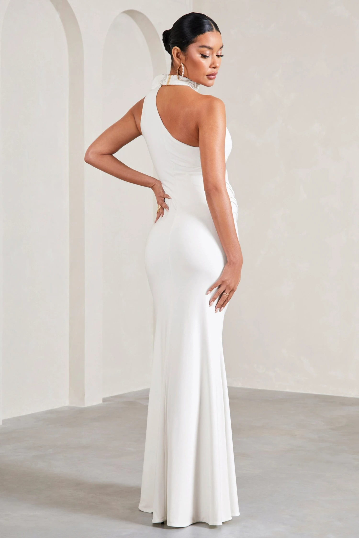 Simple yet graceful, our latest maternity maxi dress is a perfect pick for your upcoming gender reveal party. Cut from our body contouring premium jersey, My Promise is as flattering as is comfortable. Made in a soft white shade, this piece details an asymmetric neckline, floral corsage and striking high-leg split.Â