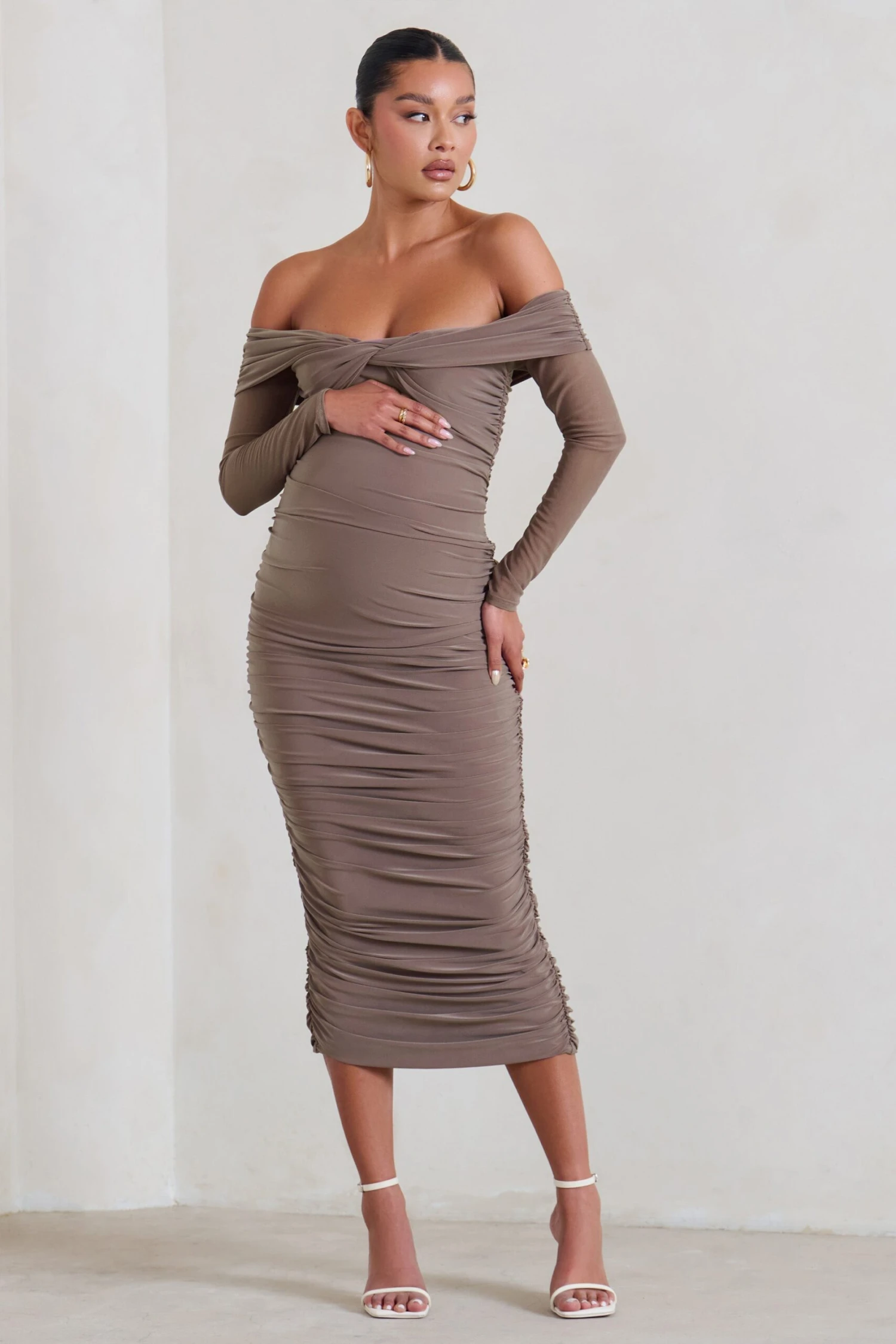 A fine layer of mocha brown mesh adds a delicate touch to our Neva maternity dress. Crafted from a luxurious double-lined jersey with plenty stretch for your growing bump, this midi dress boasts a twisted Bardot neckline, long sheer sleeves and ruching throughout. Pair our Neva with classic gold hoops for the prefect baby shower ensemble.