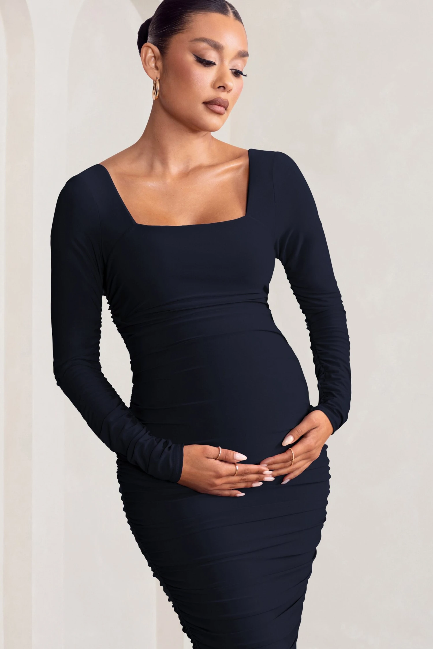 New Life | Navy Maternity Square Neck Ruched Midi Dress