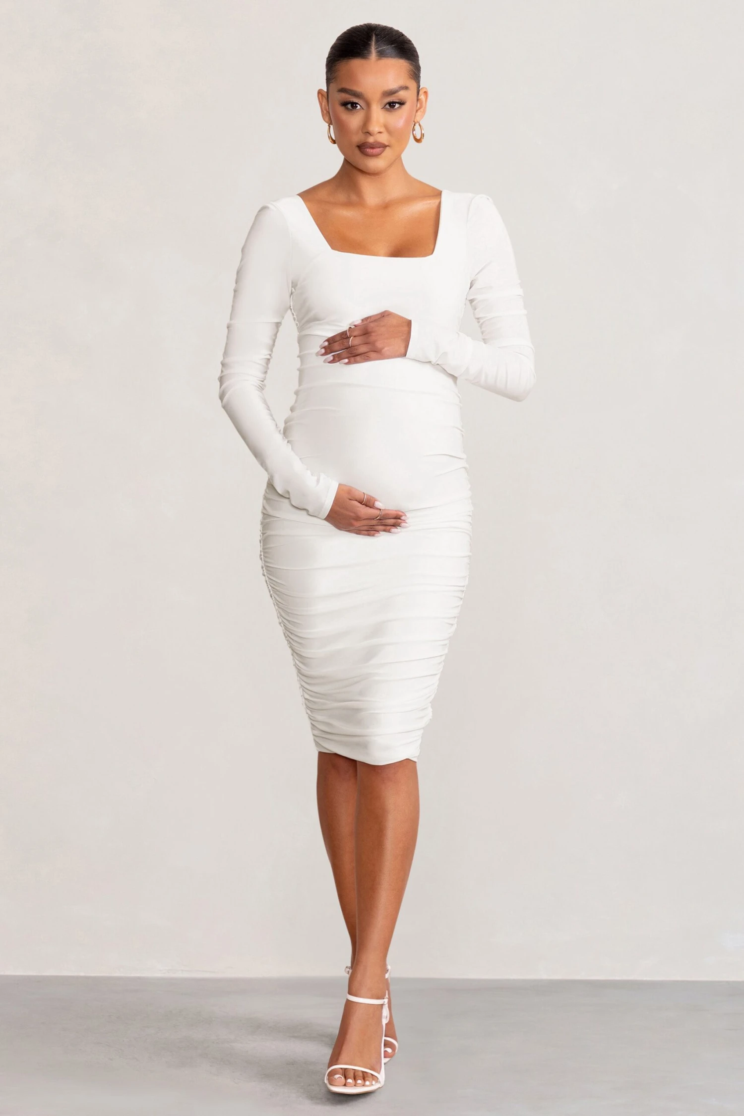 New Life | White Maternity Square Neck Ruched Midi Dress