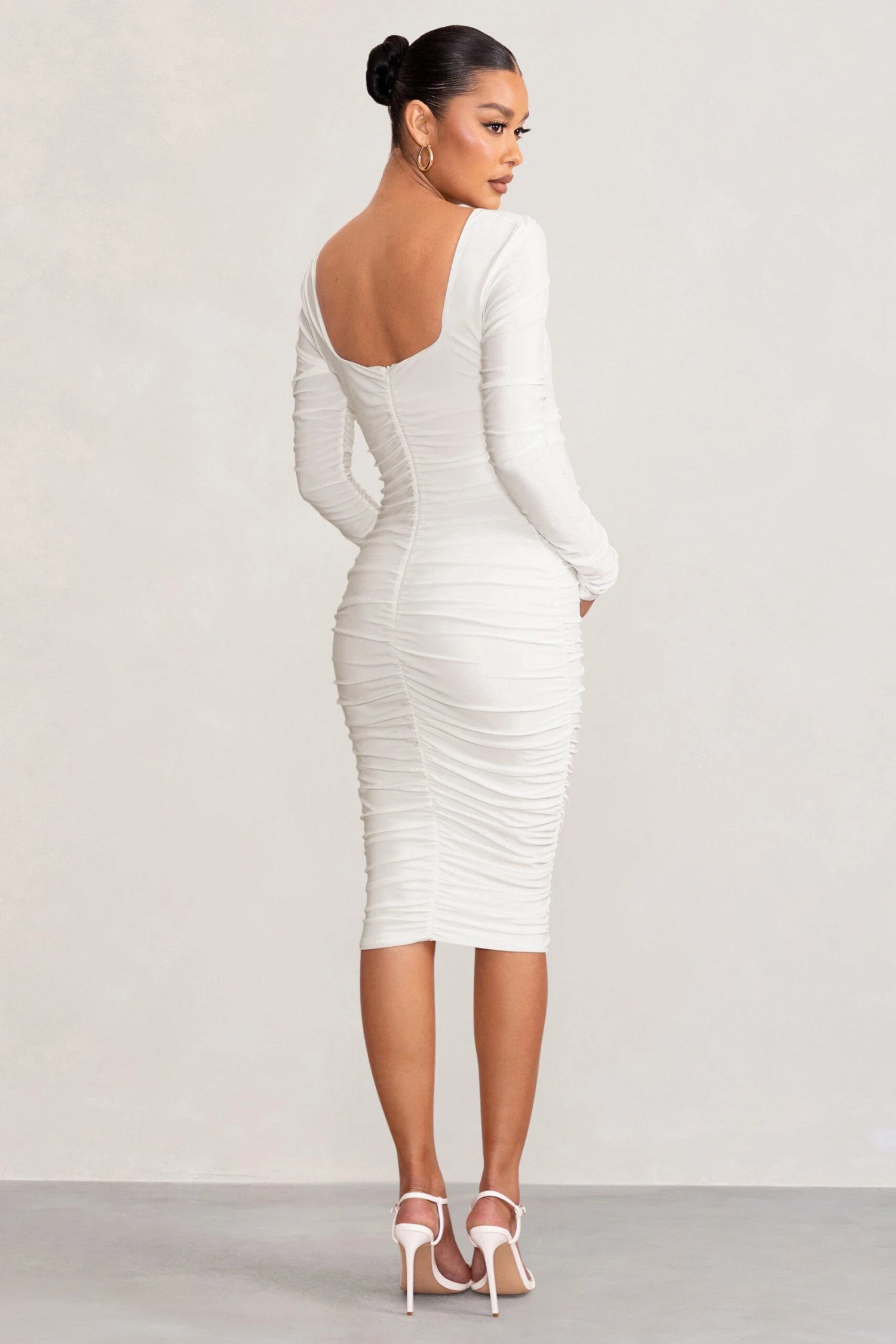 Give your blossoming body the attention it deserves in a stunning midi dress like New Life. Sculpting your figure in our signature stretch jersey, this white maternity dress comes with a square neckline, long sleeves and plenty of ruching. Pair New Life with strappy stilettos and gold hoops for the perfect baby shower outfit.