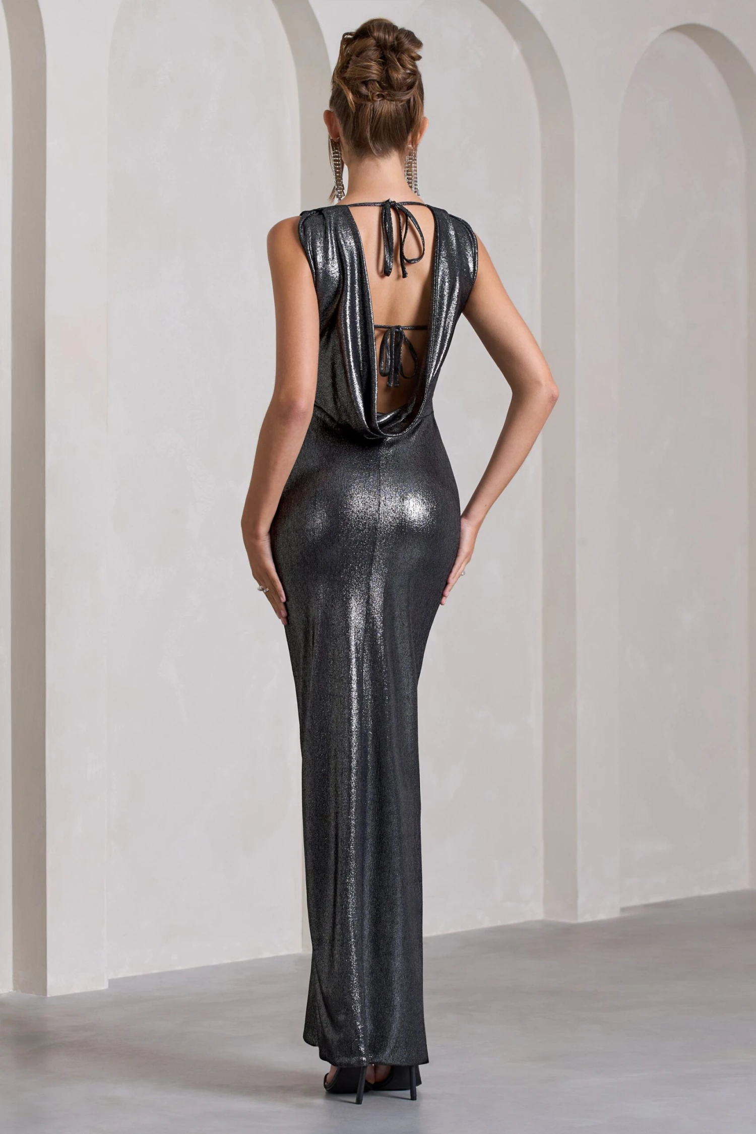 Make your next event a memorable one in this aptly-named metallic maxi dress. Crafted in a premium stretch jersey with flattering ruching that carefully traces your contours, Night To Remember is a curve-enhancing option for any special event. What transcends this silver maxi is a romantic cowl back, highlighted by two thin self-tie cami straps that delicately cross your back. For an effortless prom look, try styling this alluring style with a tousled bun and strappy stilettos.