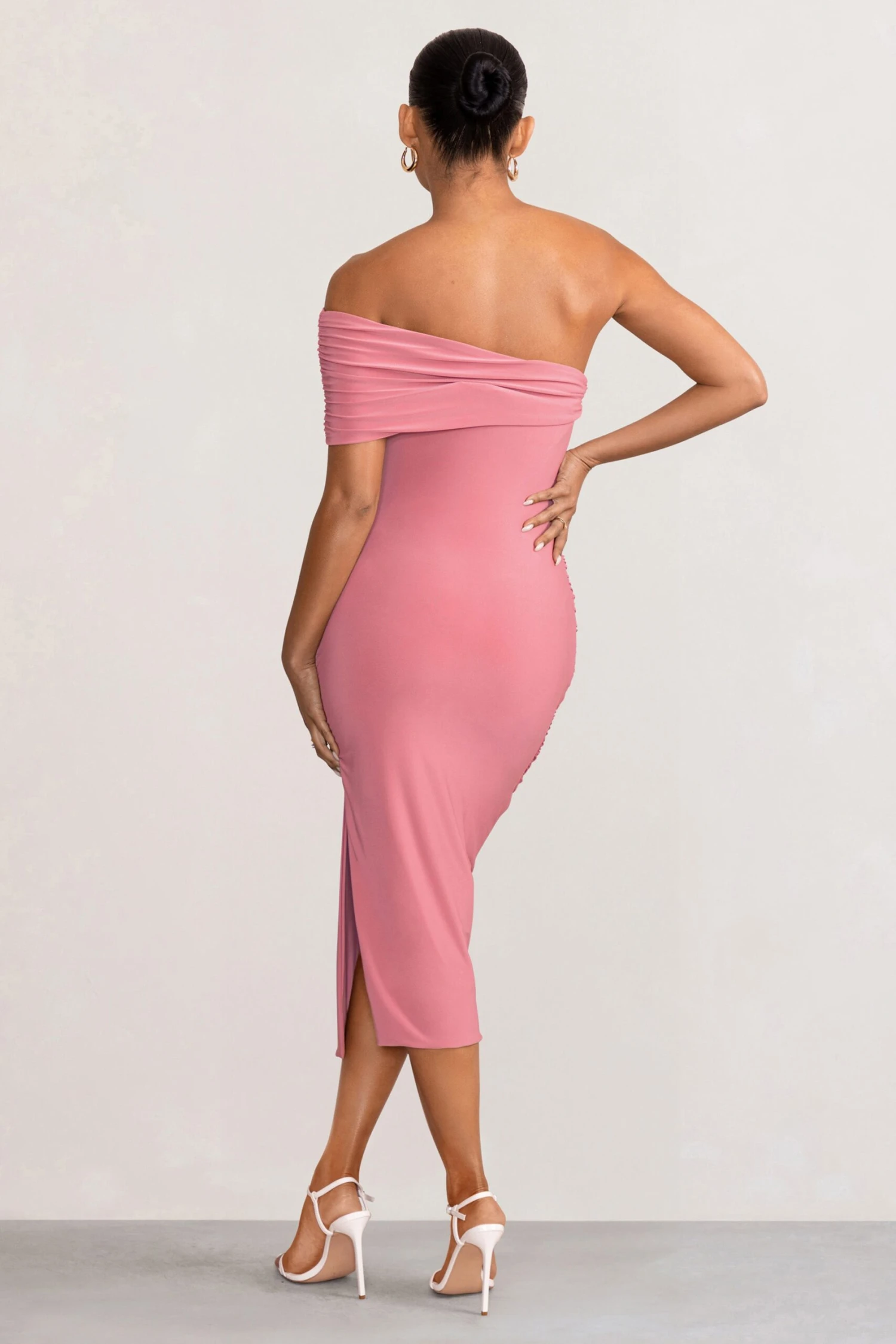 Chic yet glamorous, make a statement in Odelia our gorgeous midi dress in a beautiful blush pink hue. Crafted in our signature double-lined jersey and ruched to perfection, this dress will seamlessly contour your changing silhouette. Featuring an asymmetric one-shoulder Bardot design, bodycon fit, and subtle side split, Odelia is the perfect choice for any upcoming social engagements. Turn heads in Club L at your next event.
