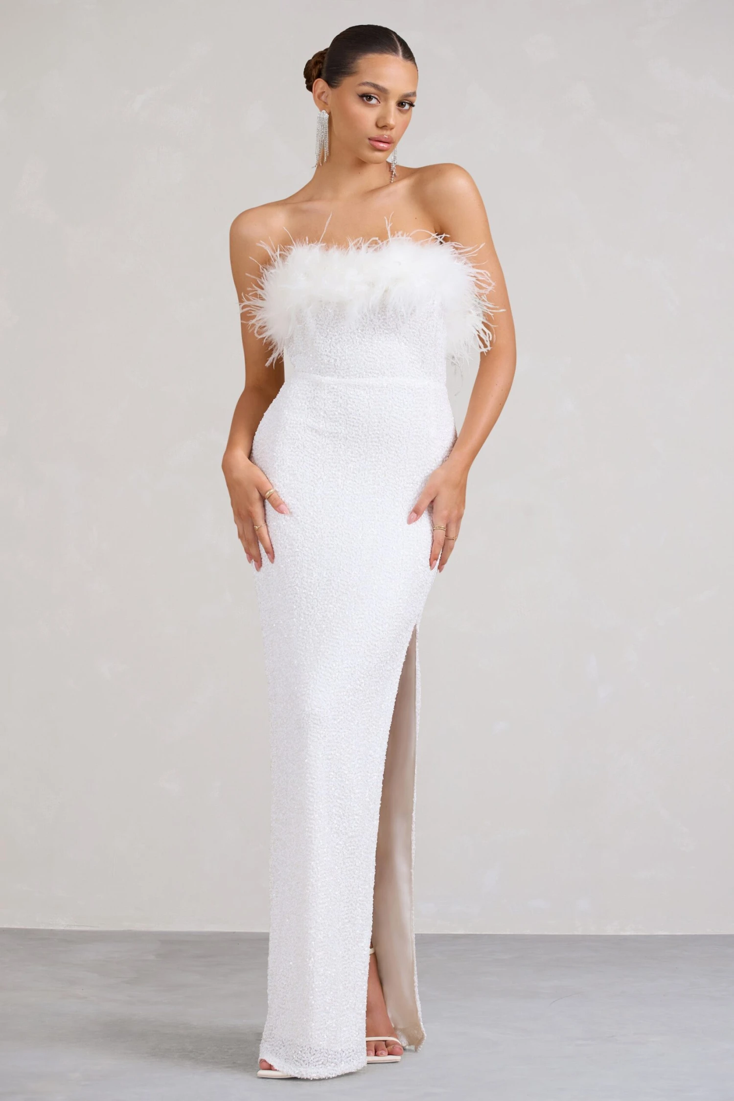 Strapless, sophisticated and showered in sequins, Old Money is the white maxi dress to make an impact at any special occasion. This shimmering showstopper features a boned corset to cinch your waistline, a high hem split and a soft feather trim. When it comes to styling this must-have maxi, opt for a pair of small diamond earrings.