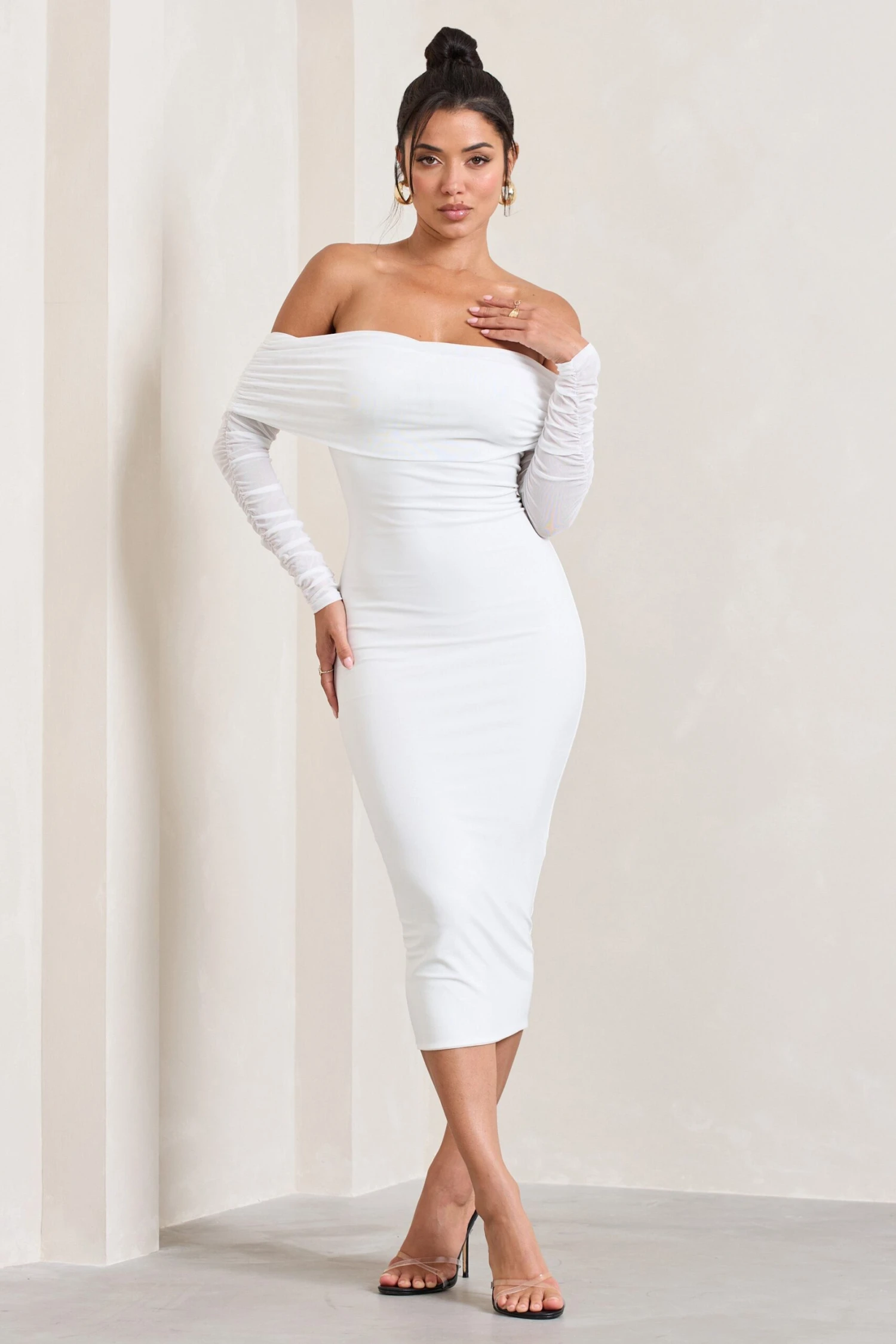 Only You | Ivory Ruched Mesh Bardot Midi Dress