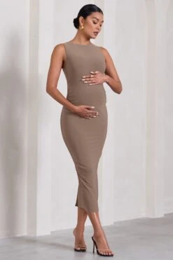 Classic in both shape and design, Paige is highlighted by its bodycon fit and flattering ruching detail. This figure-skimming maternity midi dress has been crafted in our signature stretch jersey in a soft mocha shade that compliments every skin tone. Try styling this staple with gold earrings and strappy stilettos for an elegant evening look.Â