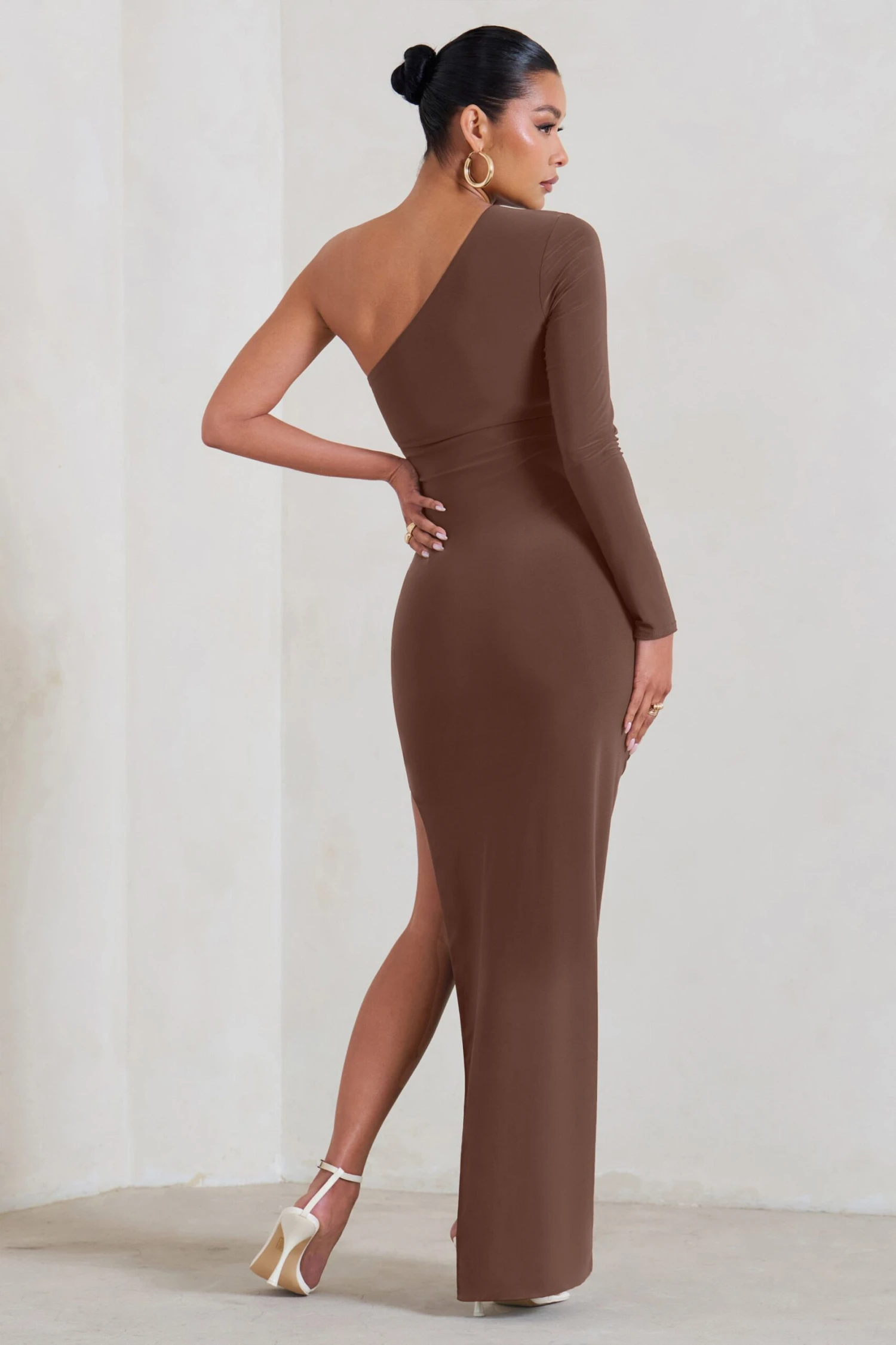 Maternity styles needn’t be understated as our stunning Paloma maxi dress proves. Designed in premium stretch jersey with ruching to flatter a growing bump, this brown bodycon dress comes in an asymmetric silhouette that exposes the left leg elegantly.