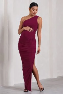 As enchanting as the Iranian country, our Persia maternity maxi dress would stand out in any formal setting from grand ballrooms to garden galas. This rich berry gown comes in a premium stretch jersey that’s fully ruched to frame and flatter your curves. Also featuring an asymmetric neckline with one shoulder strap and a long split skirt, Persia is the bodycon your figure deserves.