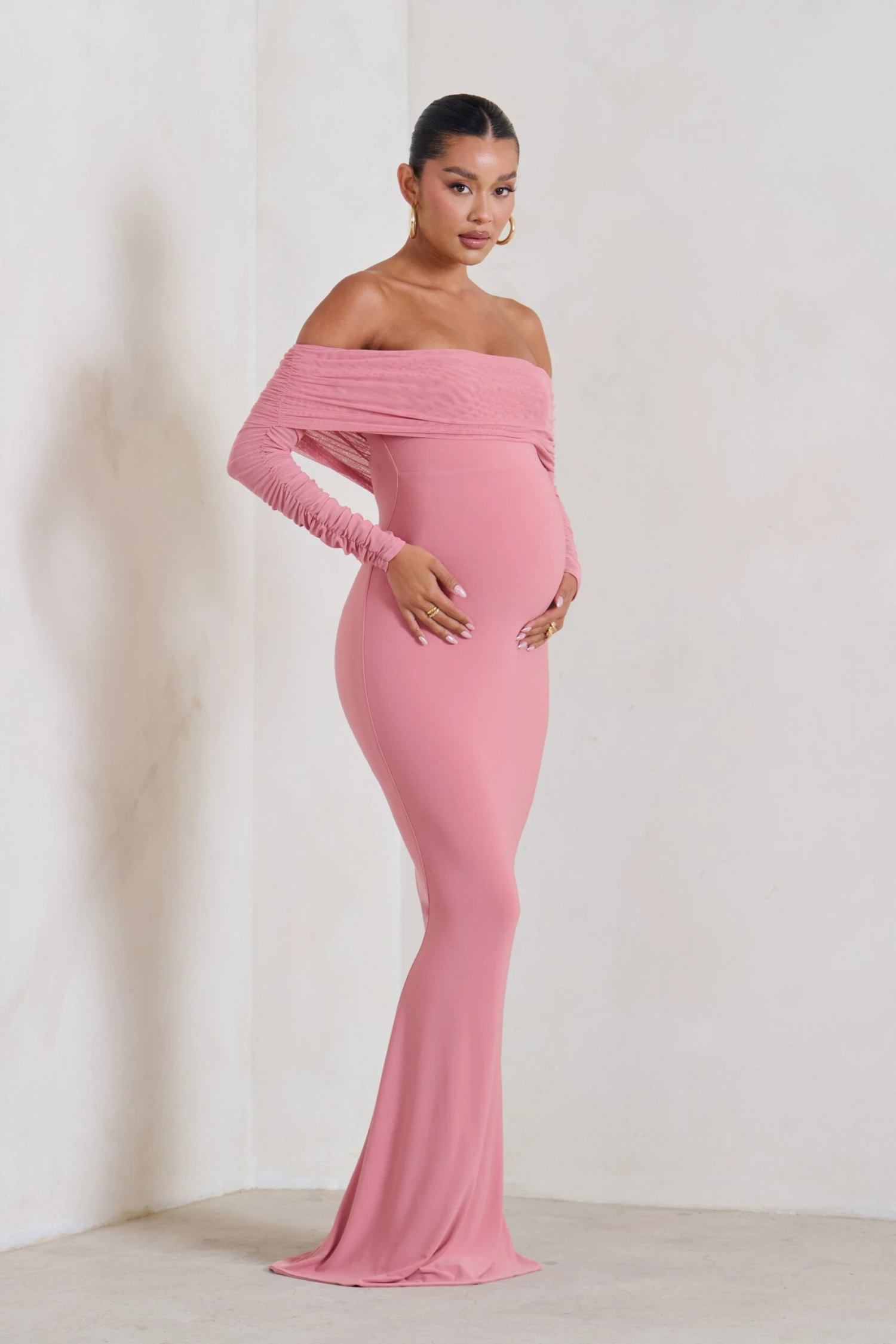 What maxi dress could be more perfect for a birthday or baby shower than this aptly-named option, Pretty Perfect? Designed in our signature stretch jersey with ruched mesh overlays, this pink maternity dress features a demure Bardot neckline, long sheer sleeves and a floor-sweeping skirt in a fishtail silhouette.