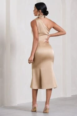 Golden Girl | Champagne Satin Asymmetric High-Neck Flared Midi Dress