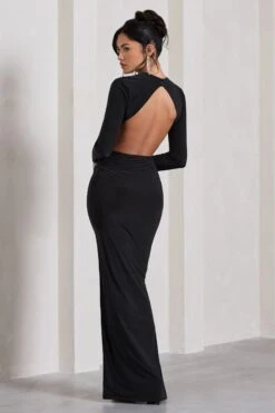 Martha | Black One Sleeve Maxi Dress With Feather Cuff And Hemline