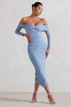 Sweet Dreams | Powder Blue Maternity Asymmetric Ruched Midi Dress