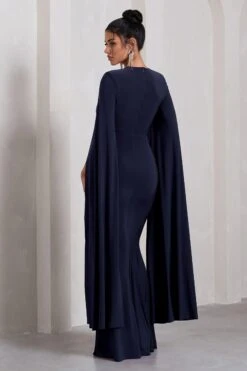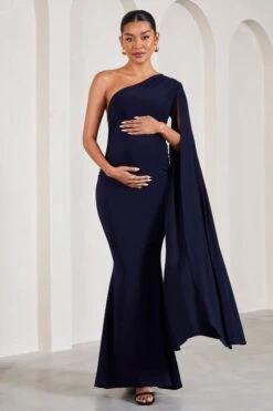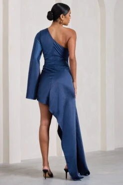 Alexia | Navy One-Shoulder Maxi Dress With Cape Sleeve And Thigh Split