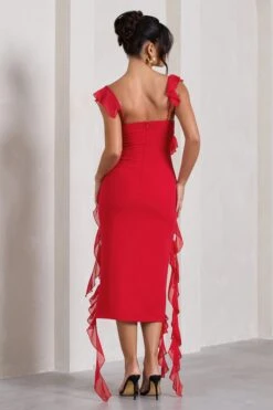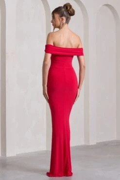 Alana | Red Long Sleeve High Neck Maxi Dress With Ruched Waist And Front Split