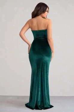 Belle Of The Ball | Bottle Green Velvet Bandeau Maxi Dress With Split Hem
