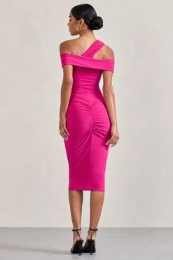 Chain Reaction | Fuchsia Pink Strappy Asymmetric Bodycon Midi Dress