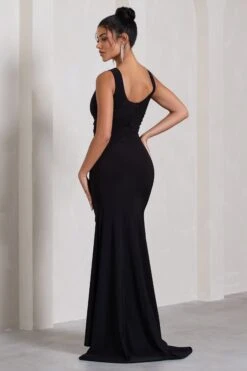 Martha | Black One Sleeve Maxi Dress With Feather Cuff And Hemline