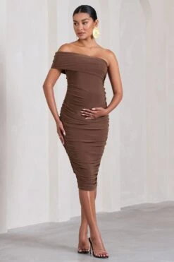 Prepare to make an unforgettable entrance at your next occasion in our aptly-named midi Remember me. Crafted in our signature chocolate stretch jersey, this fully ruched piece features an elegant single sleeve and bardot neckline. Try pairing this midi dress with some strappy stilettos for the perfect baby shower look.Â