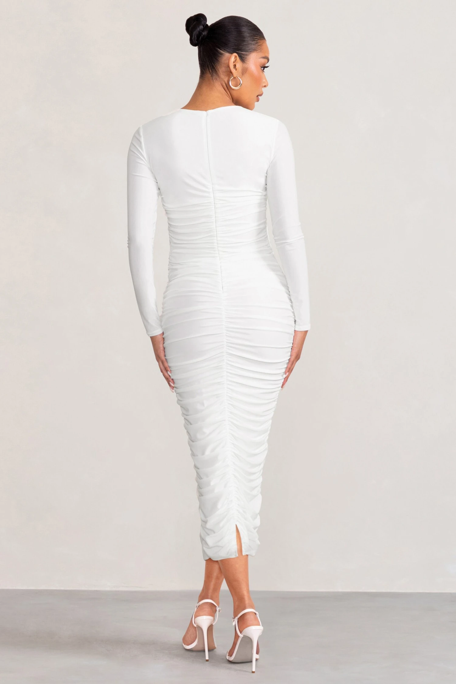 Elevate your maternity wardrobe in our gorgeous Renee midi dress. Cut from our signature stretch-jersey fabric that will contour your curves, this dress in classic white will be your go-to outfit for that special occasion. With full-body ruching, long sleeves, and a plunge twist neckline, this midi dress is designed to sculpt your bump and make a statement. Turn heads in our unmissable Renee maternity dress.