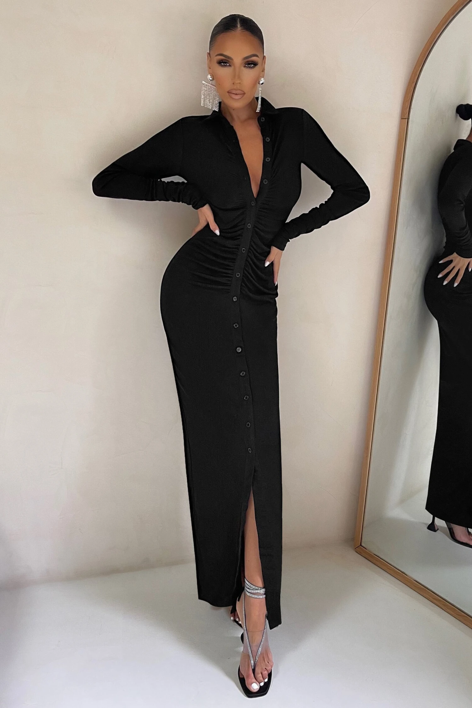 Talk about the epitome of casual glam! Our black “Restless Heart” maxi dress takes the effortless chic and glamour combo to high levels. Cut from our signature stretch-jersey, it fits you like a glove and contours your curves in all the right places. The detailed ruching highlights all your best assets, while the long sleeves add extra warmth on these cold party nights. In a gorgeous sophisticated black hue that is timeless for all seasons, this stunning long-sleeve dress has the extra edge. The button-up front allows you to switch between a modest look and something a little more sultry… Pure sophistication!
