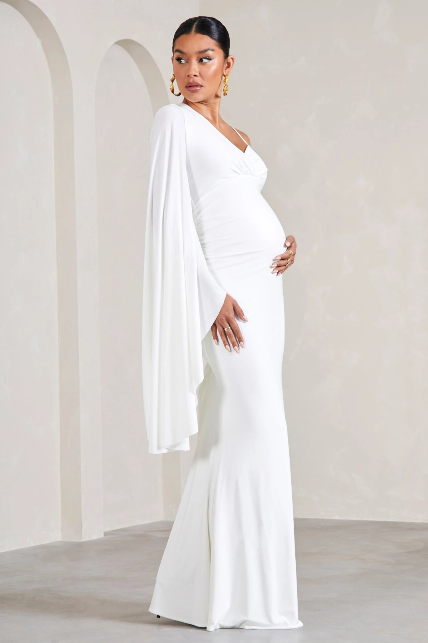 Perfect for baby showers, gender reveals and everything in between, Rhea is a formal wardrobe must-have. Crafted in a crisp white shade of our signature stretch jersey, this v-neck maternity maxi dress was designed with your comfort at the forefront. Characterised by a singular cape sleeve, Rhea concludes with subtle bump ruching and a high-leg split.